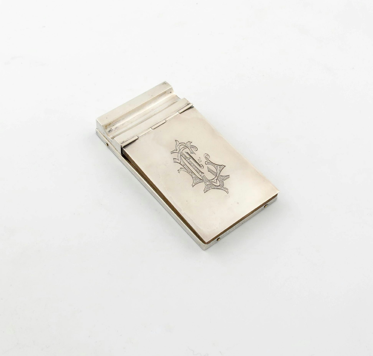 rectangular form, the hinged cover with a monogram, with a pen well, length 12.8cm.