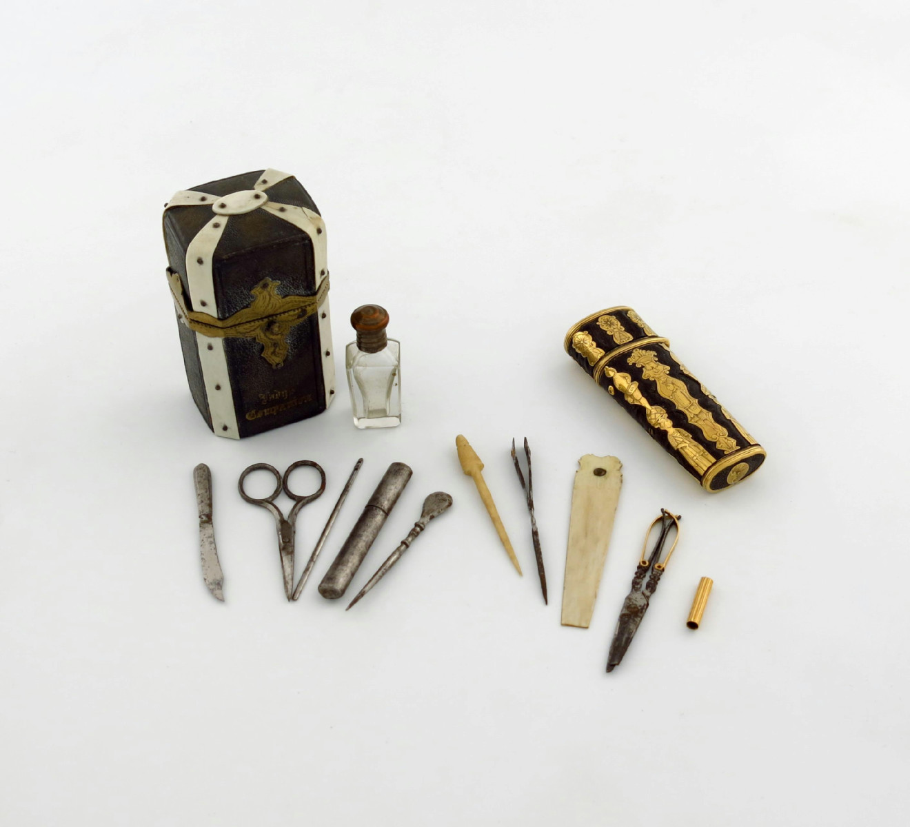 tapering oblong form, the mounts with engraved decoration, the interior with various fittings, some later, comprising: a pair of scissors, a pair of tweezers and other items, length 9.4cm, plus a 'lady's companion' sewing case, with steel fitting and a glass scent bottle, height 9cm. (2)