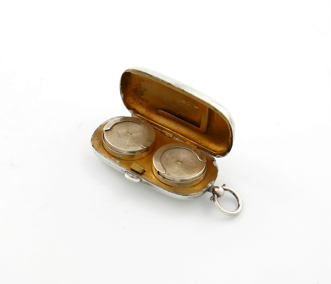 rounded oblong form, the interior of the hinged cover with a stamp holder, with a ring attachment, length 7.3cm, approx. weight 1oz.