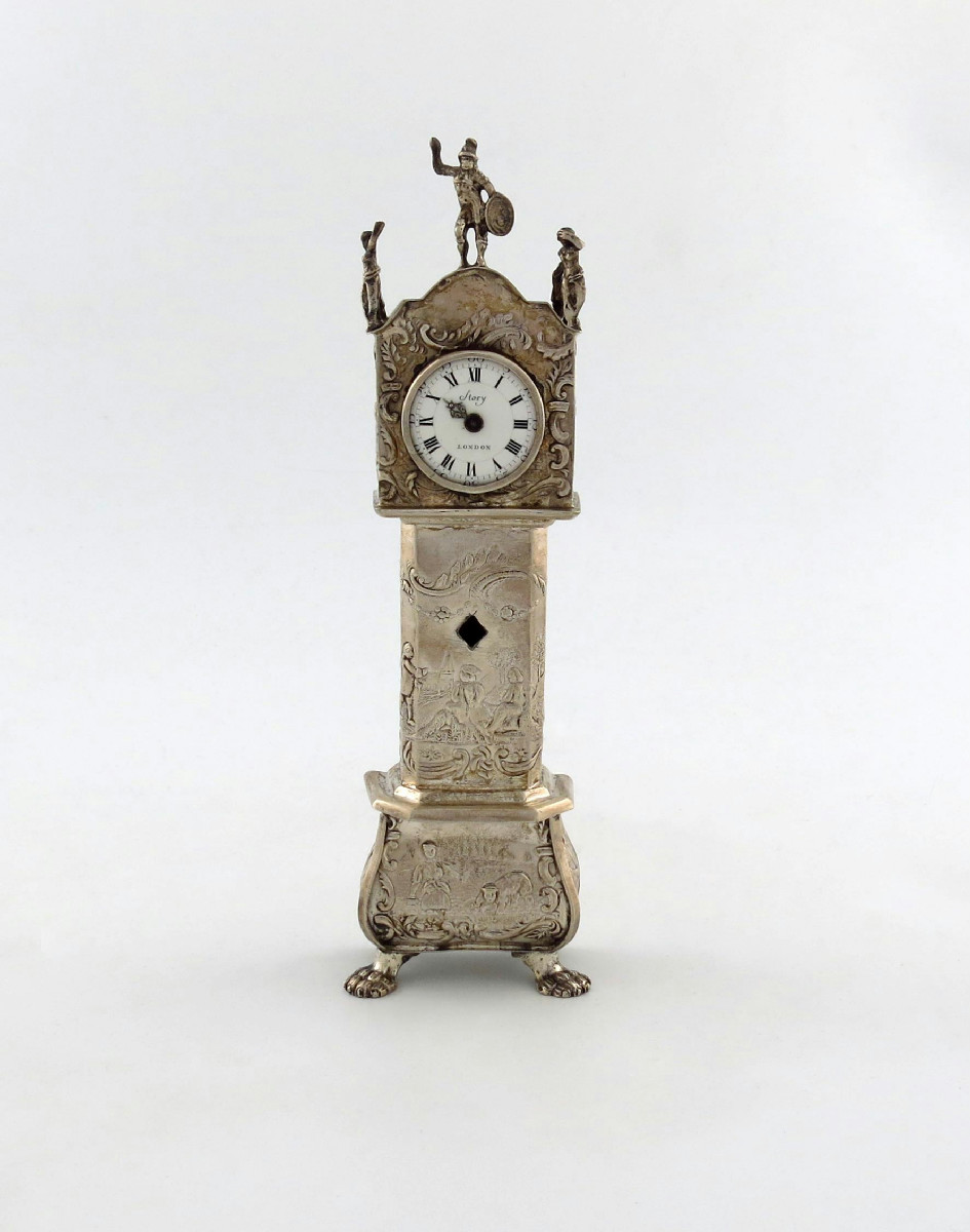 upright rectangular form, with figural and foliate scroll decoration, with an English enamel face and mounted with three figures, on four feet, height 23.5cm.