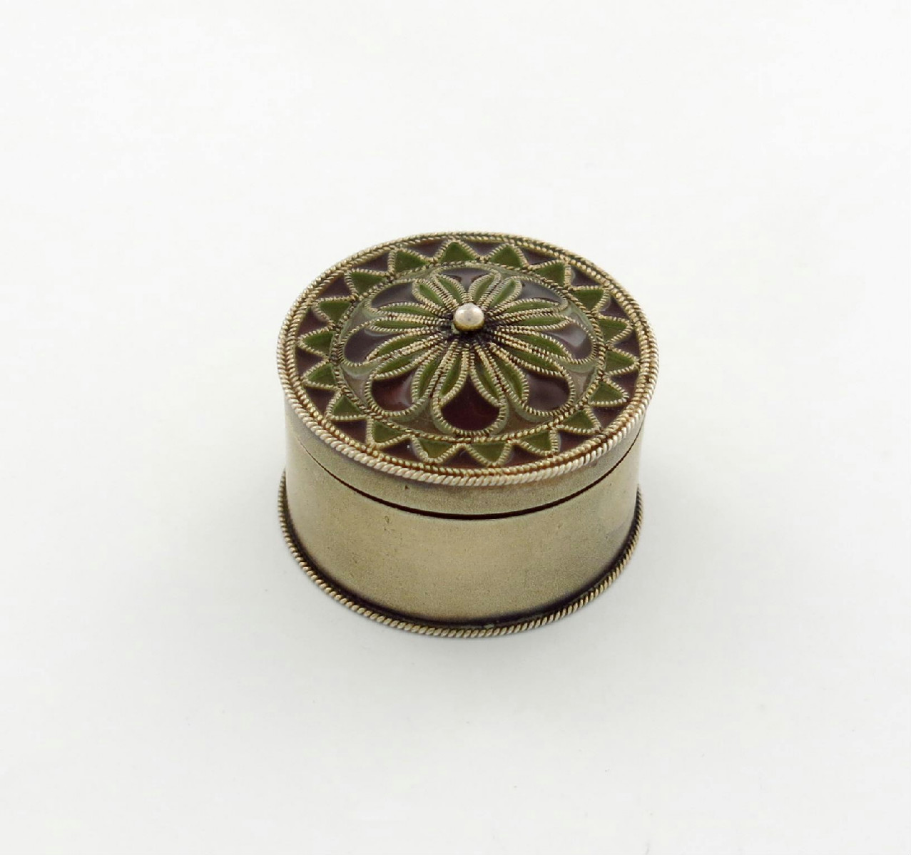 circular form, the hinged cover with a flower and red green enamel decoration, rope-work borders, with a ring attachment, diameter 2.7cm.