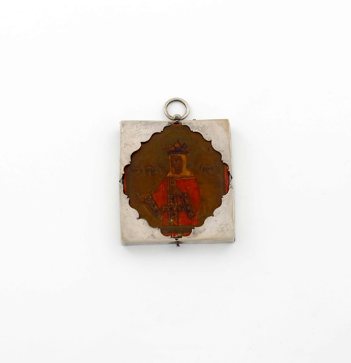 the frame of rectangular form, shaped borders, with a ring attachment, the icon with a scene of a saint, height 6.2cm.