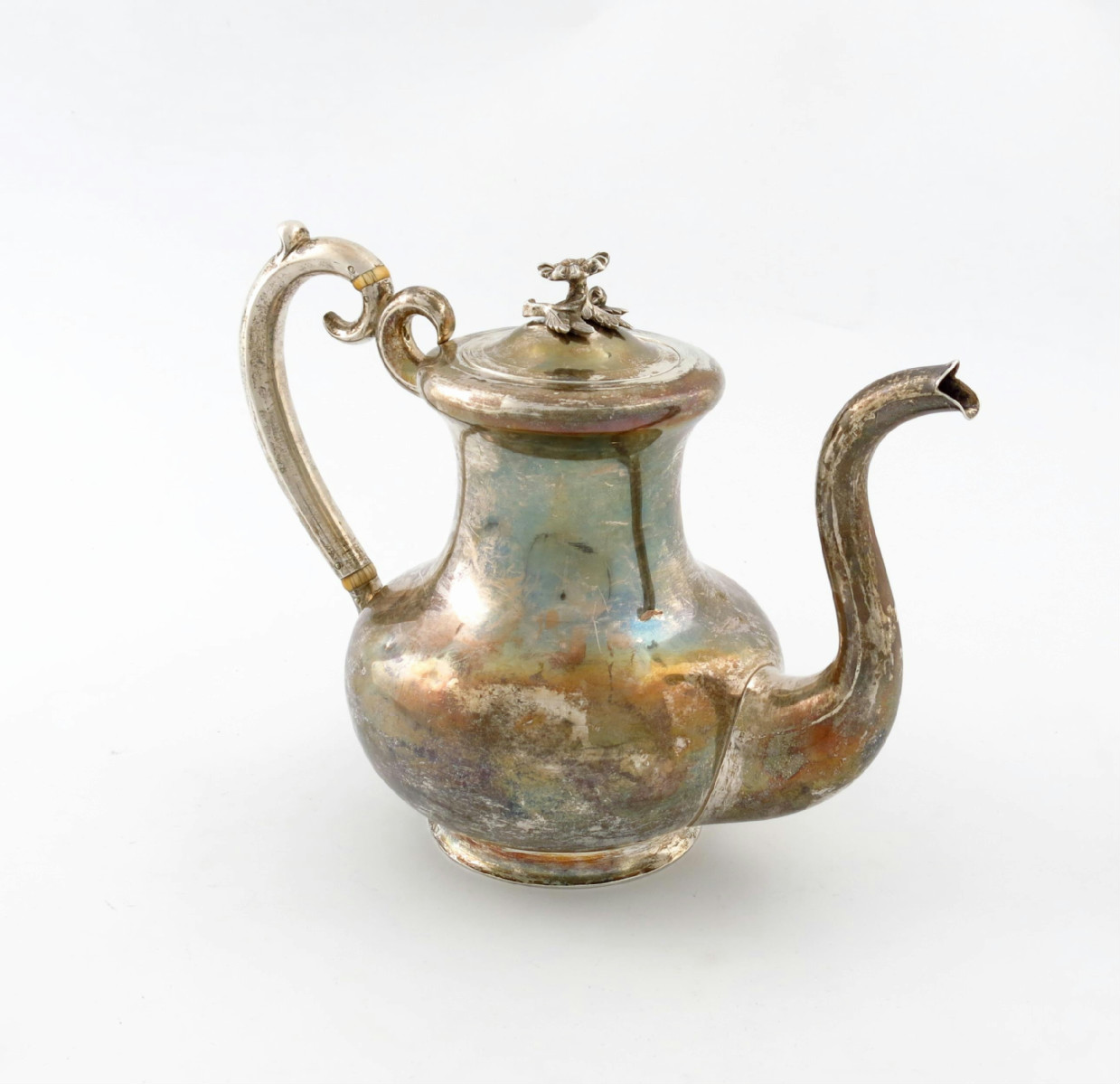 baluster form, double scroll handle, the pull-off cover with a flower finial, on a circular foot, height 19cm, approx. weight 26oz.