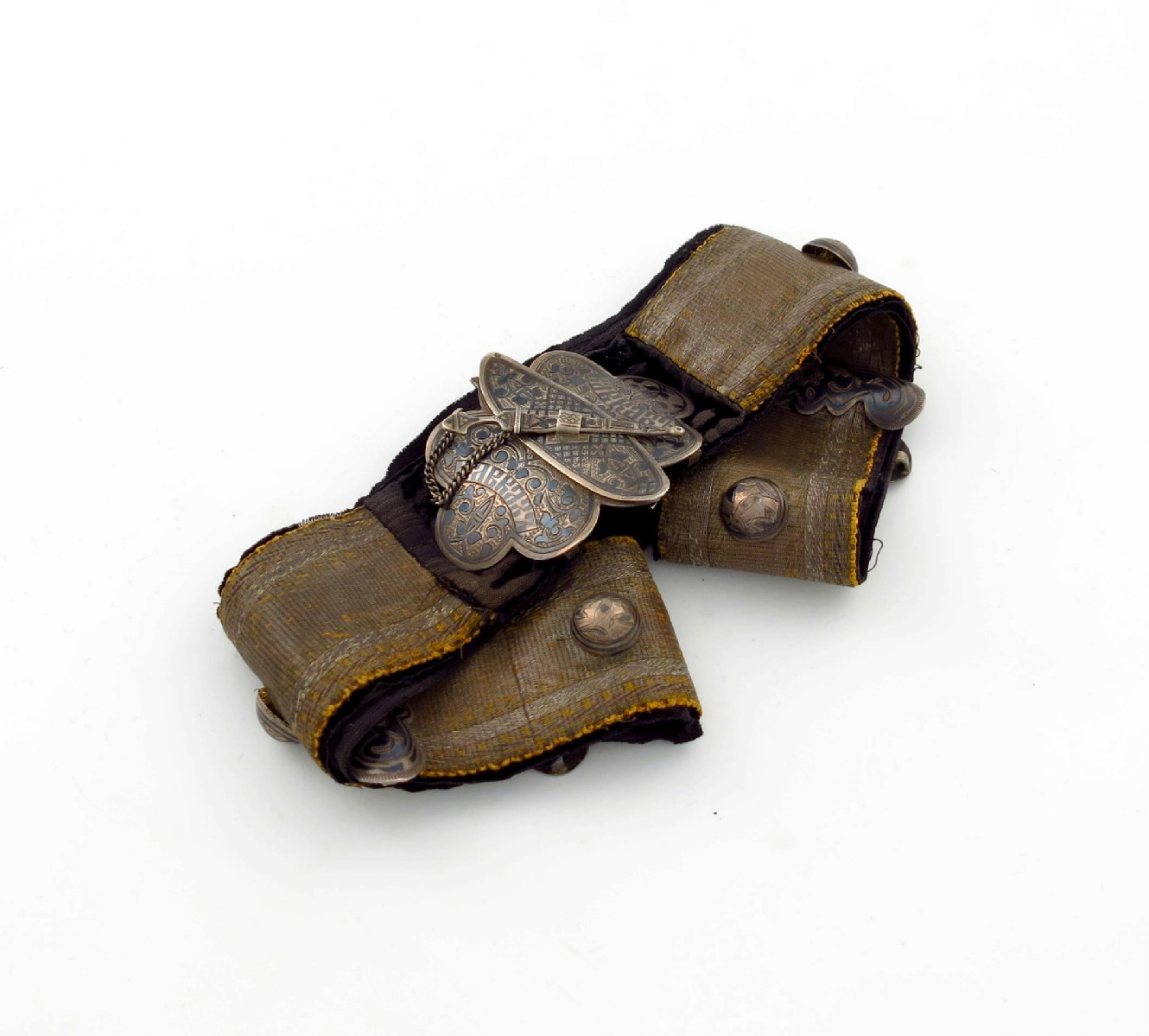 the clasp with a dagger pin, and scroll decoration, with niello letters, total length 73.5cm.