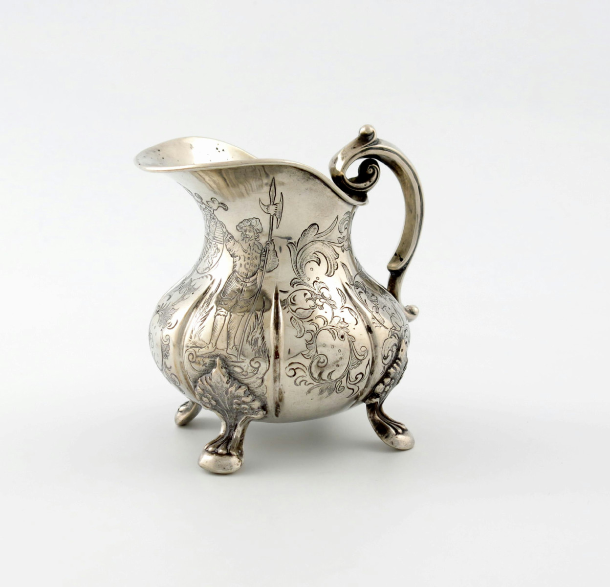 lobed baluster form, scroll handle, the base set with a coin from Hamburg 1795, the front with an armorial, on four foliate capped scroll feet, height 11.2cm, approx. weight 6oz.