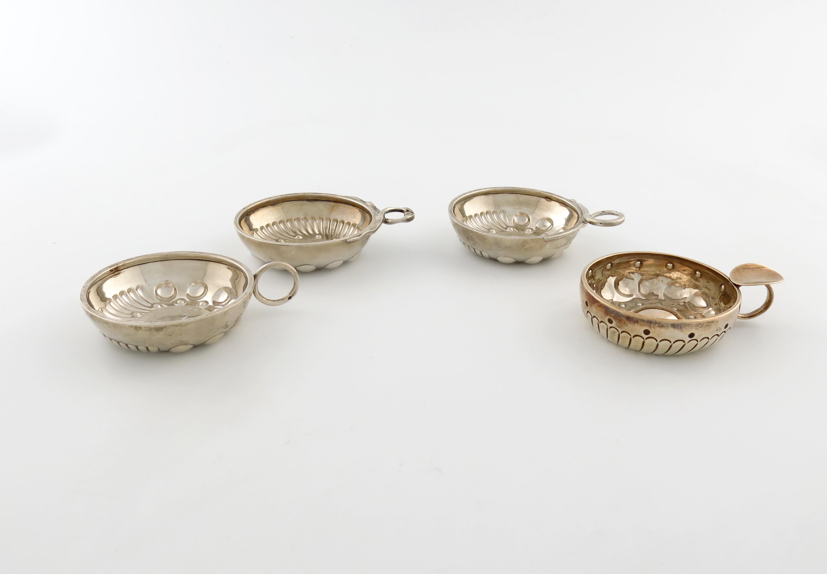 circular form, punch and fluted decoration, snake ring handles, three set with coins, approx. total weight 10.5oz. (4)