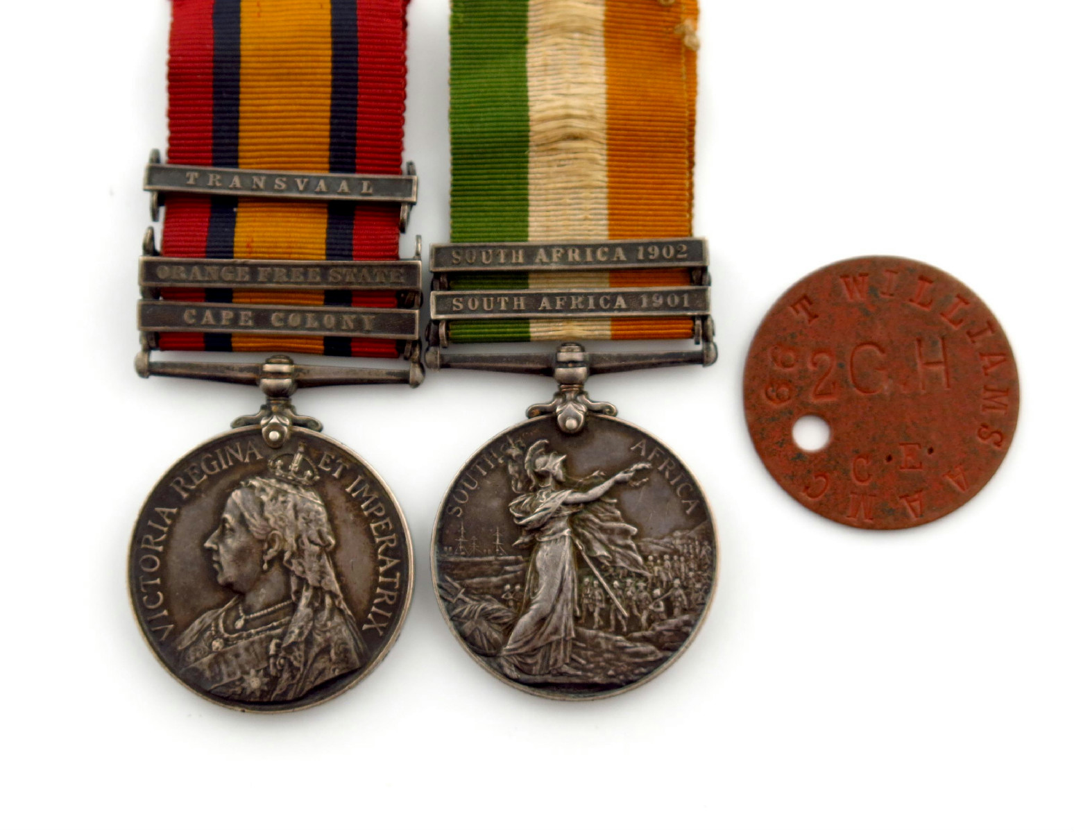 Boer War, unusual pair of Medical Corps medals, one British one Australian; QSA, three clasps, CC, OFS, Trans. (13146 Pte. T. Williams. R.A.M.C.); K.S.A. (1308 Pte. T. Williams. Aus: A.M.C.), with Australian 'dog tag' . Very fine. (3)