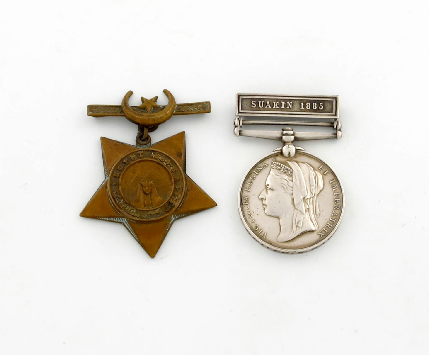 Egypt and Sudan, a pair to a driver on the projected Suakin to Berber Railway; Suakin, on the Red Sea, to Berber; Egypt and Sudan medal, 1882-1889, clasp, Suakin 1885 (Engine Driver G Rawlinson); Khedive's Star, 1884-6. Very fine. (2)