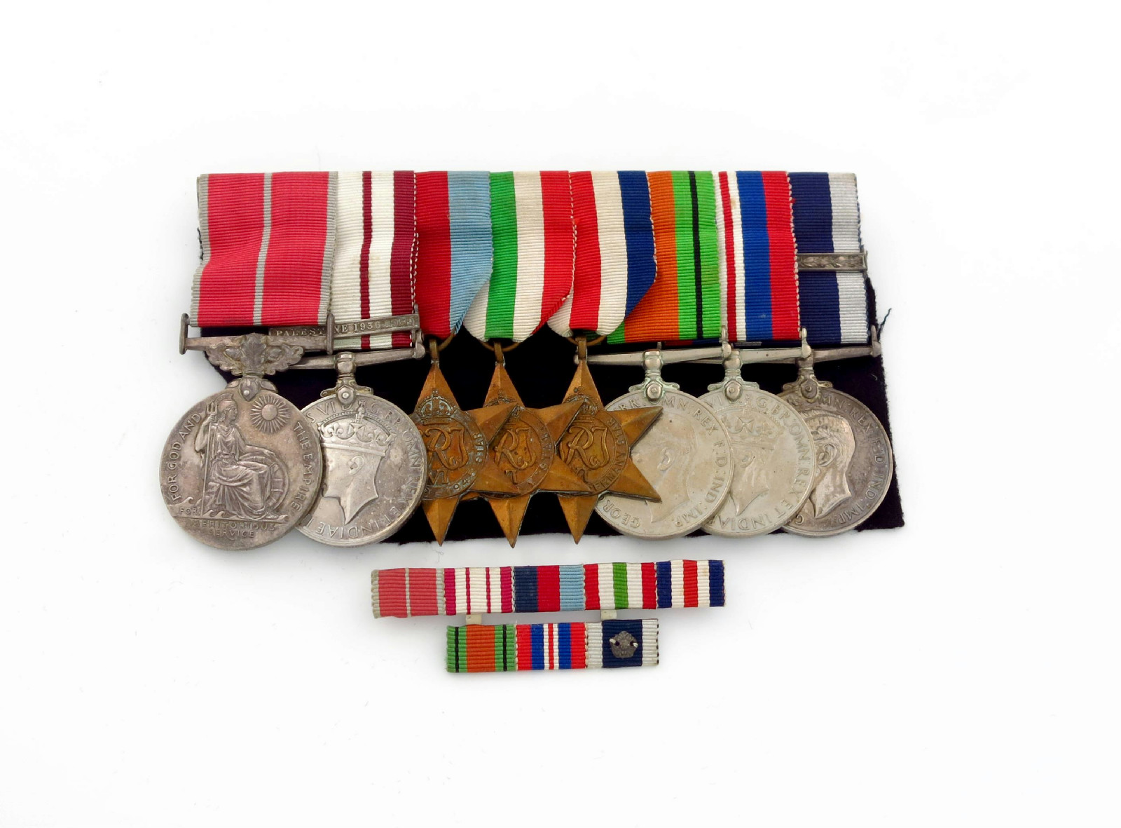 A Pre-War and World War II Naval group of eight, British Empire medal, military, E II (S.C.P.O. (V) Norman J. D. Finlay. P/M 38965), Naval General Service, G VI, clasp Palestine 1936-1939, 1939-1945, Italy, France and Germany stars, Defence and War medals, LS & GC, G VI (HMS Victory), with clasp, brooch mounted. Good very fine.