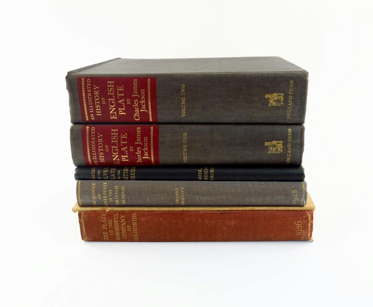 Six volumes of silver-related volumes, including Grimwade, A. G., Silver at Althrop, reprinted for the Society of Silver Collectors from The Connoisseur, October 1962, March, June, December 1963, March 1964, paperback; Carrington J. B. and Hughes, G. R., The Plate of the Worshipful Company of Goldsmiths, 1926, cloth bound; Jackson, C. J., An Illustrated History of English Plate, 1967, hard bound and three other publications. (6)