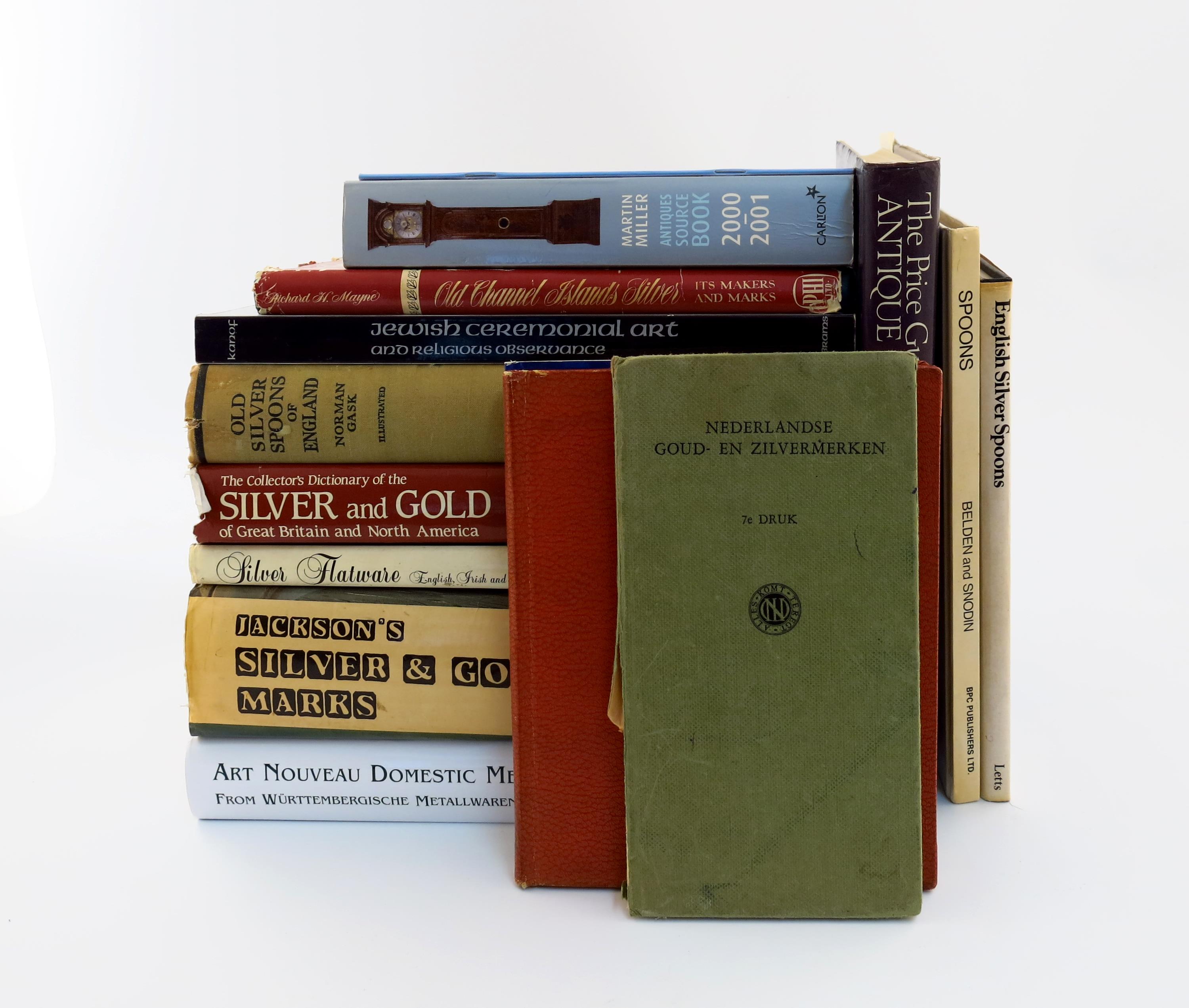including: Clayton, M., The Collector's Dictionary of Silver and Gold of Great Britain and North America, signed by the author, 1985; Waldron, P., The Price Guide to Antique Silver, 1982; Jackson's Silver and Gold marks, edited by Ian Pickford, 1989, and thirteen other volumes. (16)