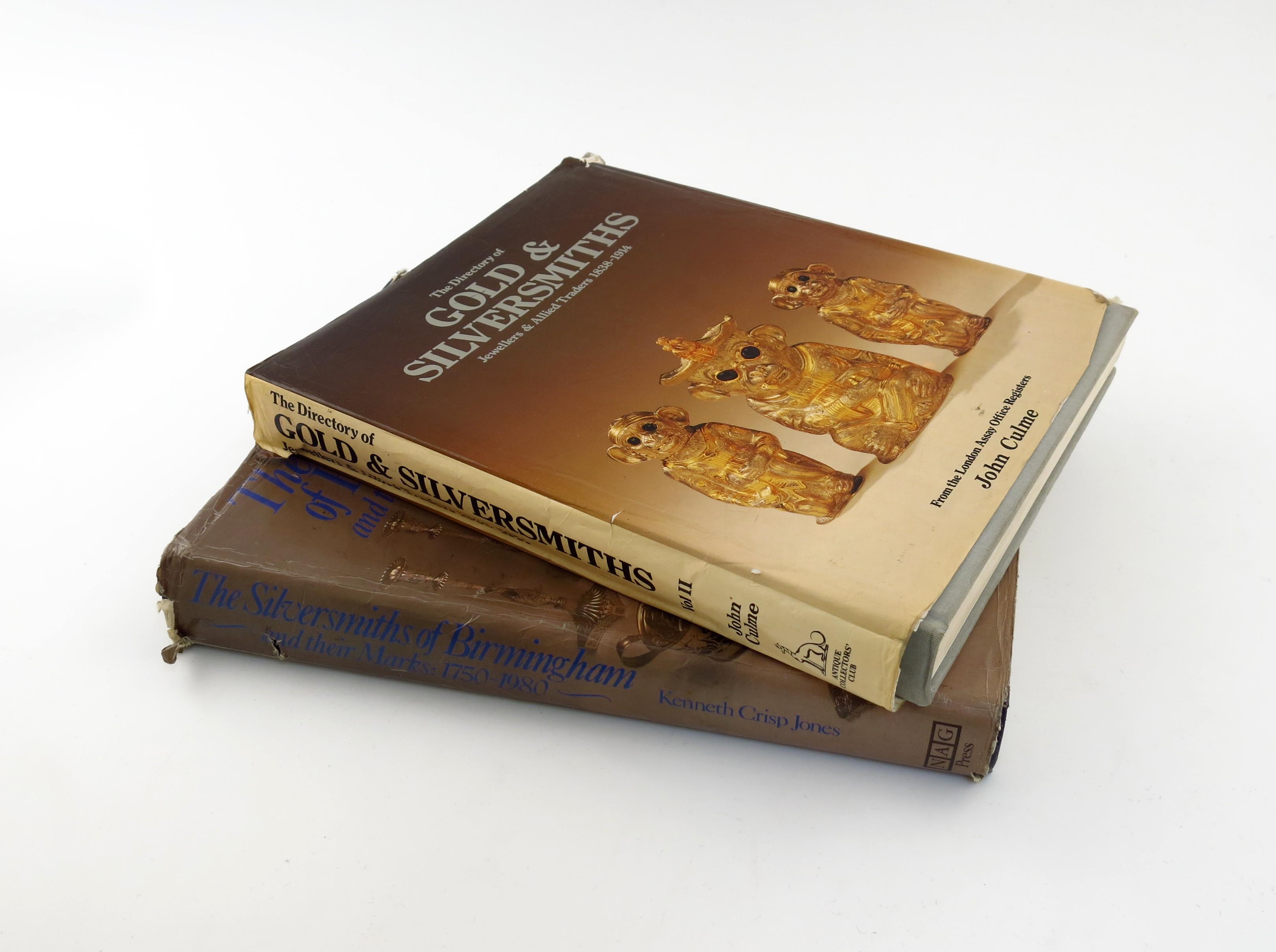 Culme, J., The Directory of Gold & Silversmiths: Jewellers & Allied Traders 1838-1914, Antique Collectors Club, 1987, hard bound with dust wrapper, volume II; Crisp Jones, K., The Silversmiths of Birmingham and their marks: 1750-1980, N.A.G. Press Ltd, 1981. (2)