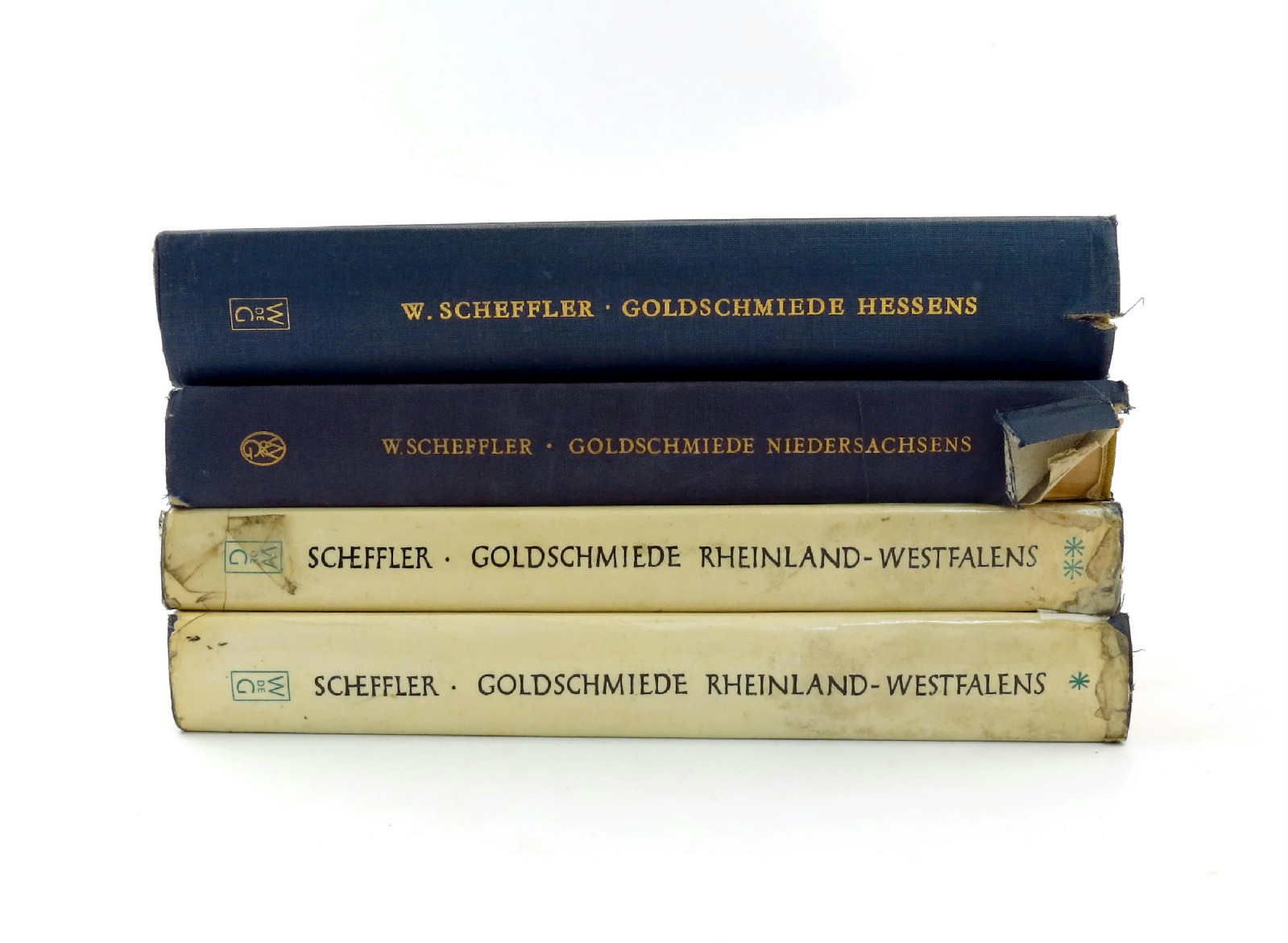 Scheffler, W., Goldschmiede Rheinland-Westfalens, Walter de Gruyter 1973, two volumes, hard bound with dust cover, and by the same author, Goldschmiede Niedersachsens, Walter de Gruyter & Co, 1965, two volumes, hard bound. (4)