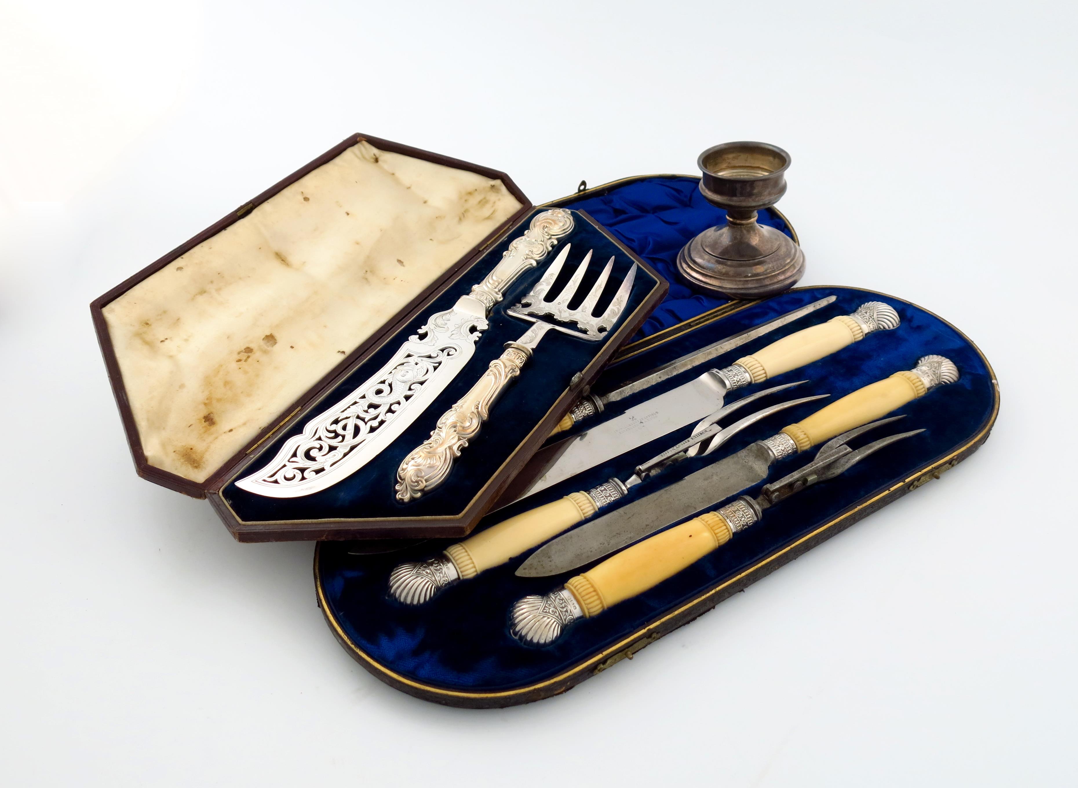 comprising: a cased five-piece Victorian silver mounted carving set, Sheffield 1890, ivory handles, fluted mounts, plus a cased pair of Victorian silver-handled fish servers, with an electroplated blade and tines, scroll decoration, and a silver candlestick. (3)