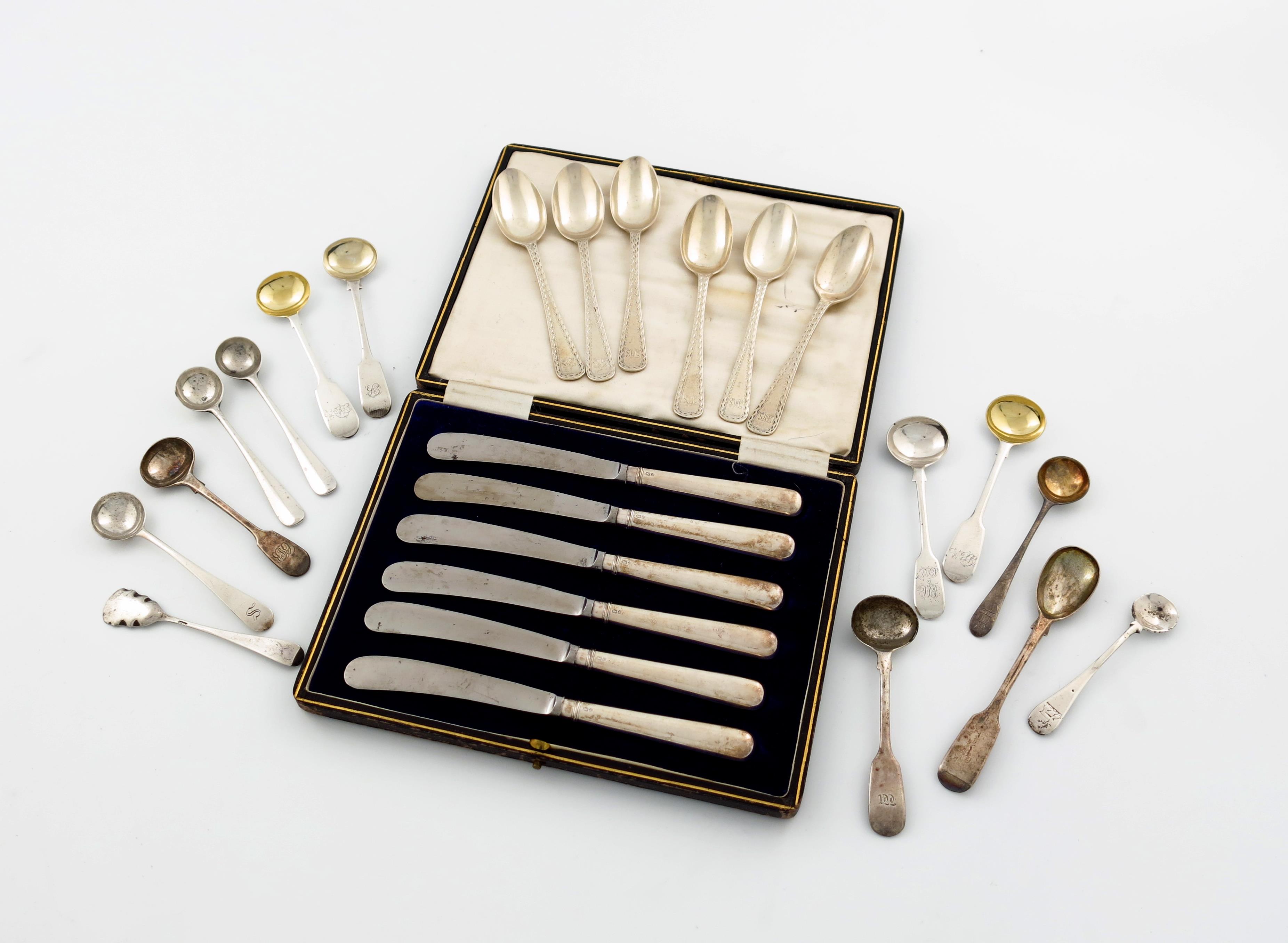 comprising: a set of six teaspoons, two mustard spoons, eleven salt spoons and a cased set of six silver-handled tea knives, approx. weight 8oz. (qty)