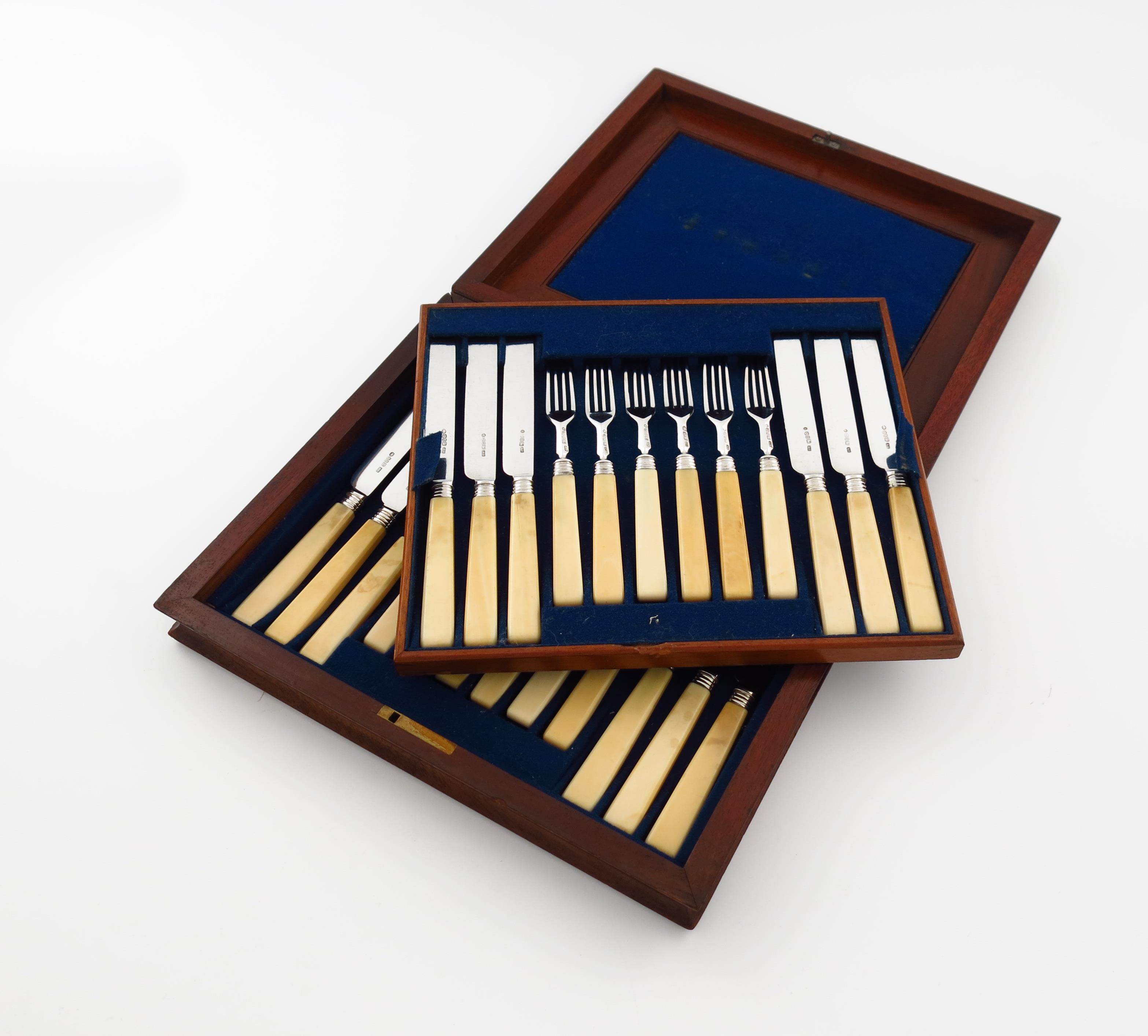 plain blades and tines, ivory handles, in a fitted case.