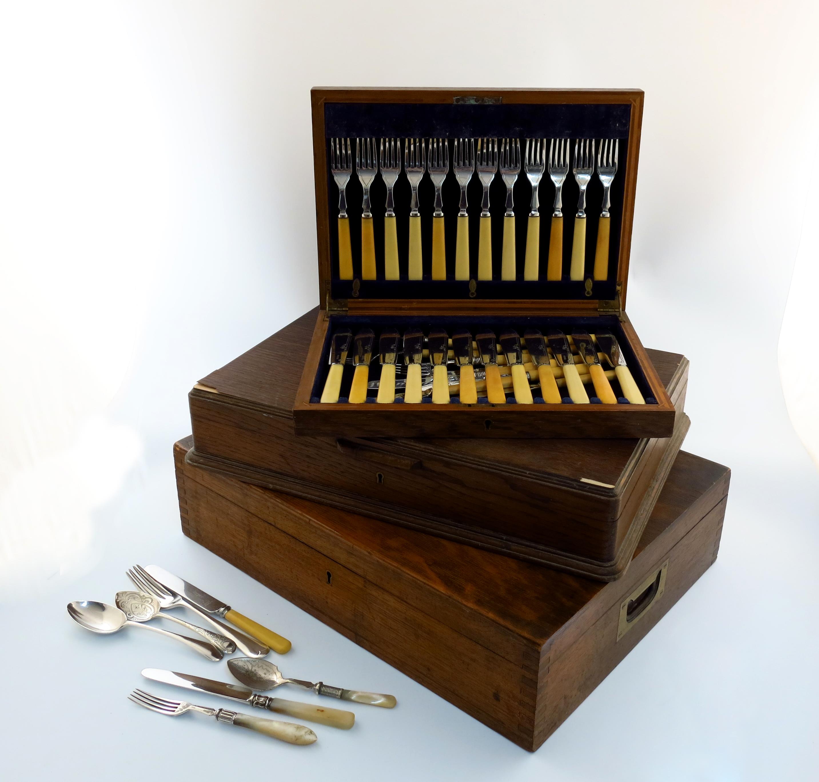 comprising: eleven table forks, twelve dessert forks, eleven dessert spoons, twelve soup spoons, eight teaspoons, a soup ladle, two table spoons, ten table knives, eleven dessert knives, and a three-piece carving set, in a fitted case, plus a set of twelve fruit knives and forks, with mother-of-pearl handles, and a cased set of twelve fish knives and forks, plus other items of flatware. (qty)