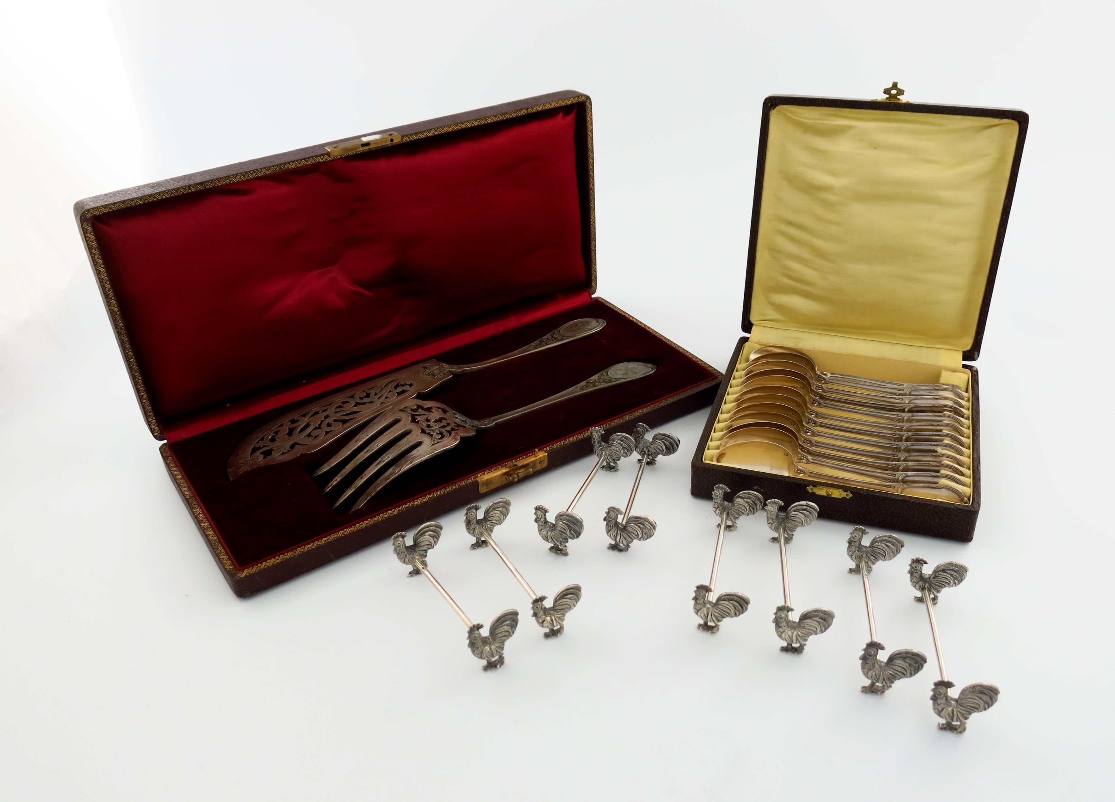 comprising: a cased pair of fish servers, the handles with foliate decoration, pierced blade, a set of twelve French teaspoons, the handles with ribbon tied decoration, in a fitted case, plus a set of eight Portuguese knife rests, with cockerel supports, approx. weight 33oz. (qty)