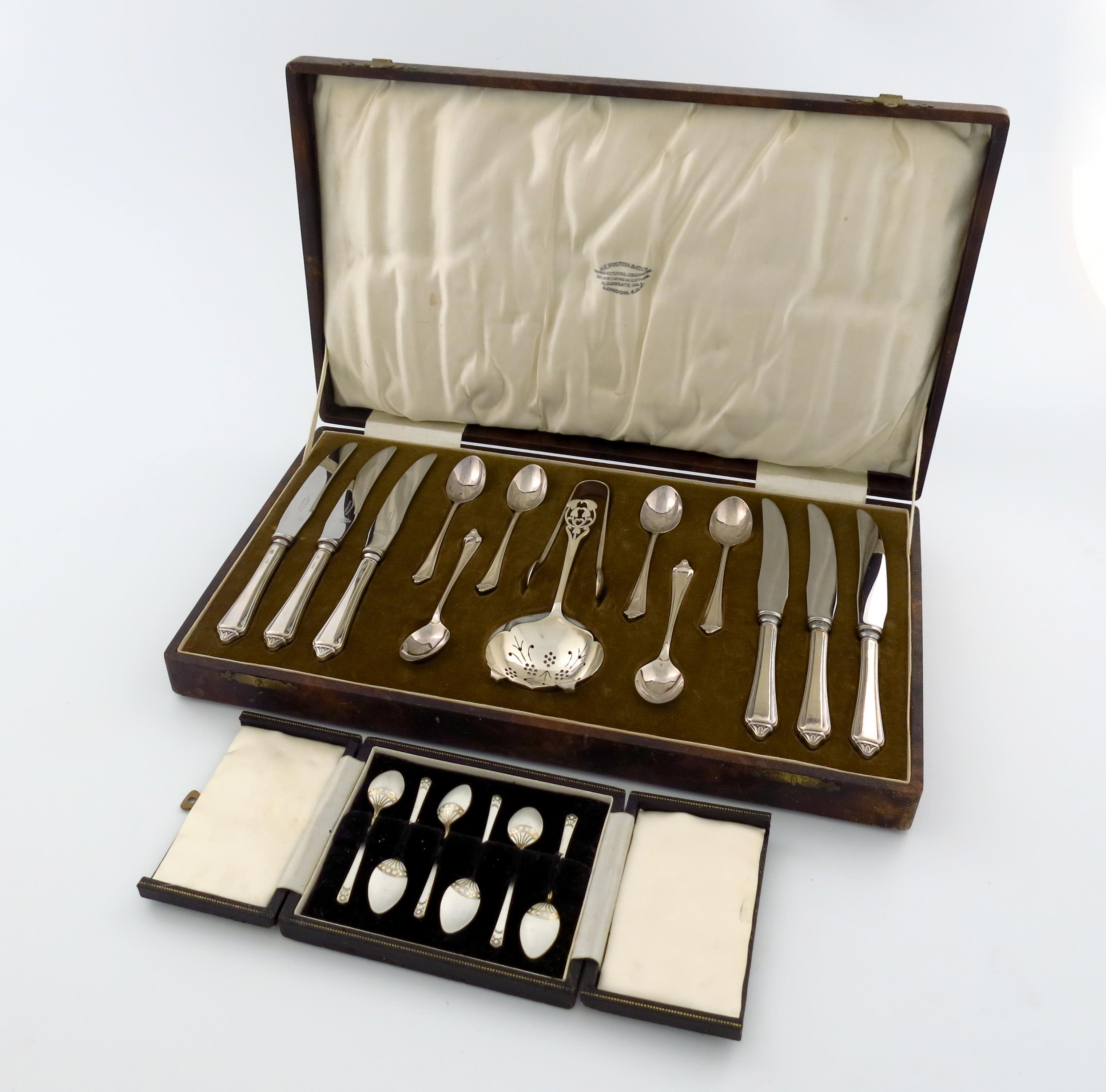 a set of six silver and enamel coffee spoons, Birmingham 1960, with white enamel decoration, in a fitted case, plus a cased silver tea set, various dates and makers, comprising: a tea strainer, a pair of sugar tongs, six teaspoons and six tea knives. (2)