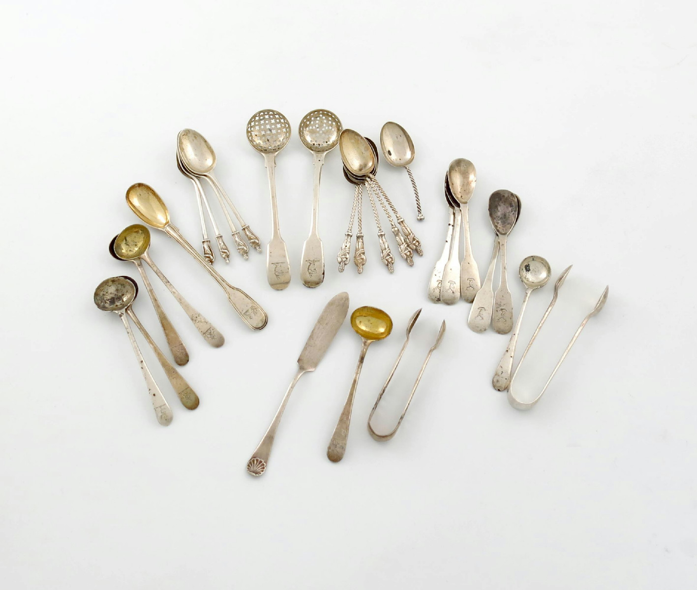 comprising: a set of five Irish mustard/egg spoons, two sifting ladles, a mustard spoon, six salt spoons, a butter knife, eight Apostle teaspoons, and one other a.f, approx. weight 10oz. (qty)