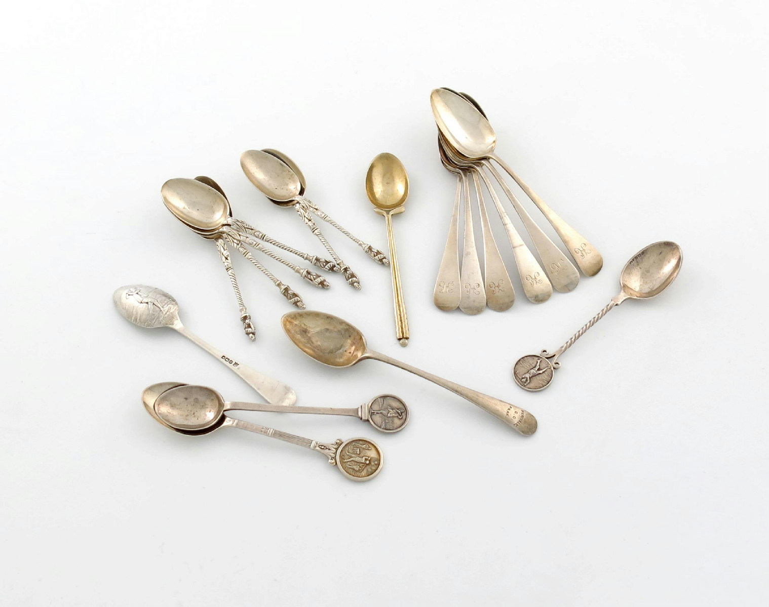comprising: a set of six Victorian provincial Old English pattern teaspoons, by Josiah Williams and Co, Exeter 1878, plus a set of six Apostle teaspoons, a golf picture-back spoon, and five other golf spoons, approx. weight 8.7oz. (qty)