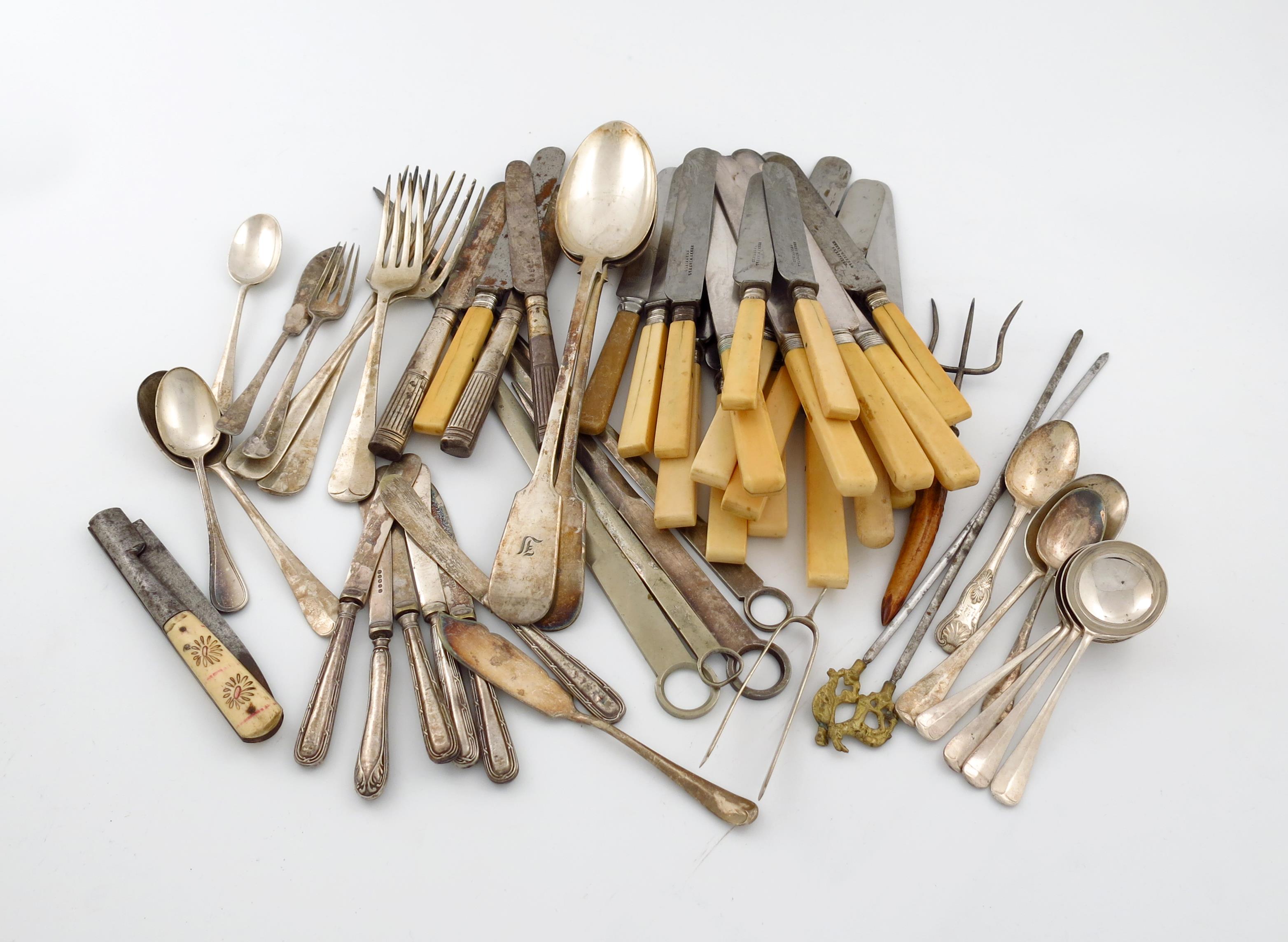 comprising: a bone-handled folding knife, the handle with painted decoration, a set of six table knives, six further table knives, five dessert knives, three silver-handled knives, plus electroplated items: a pair of basting spoons, four meat skewers, a pair of wishbone sugar tongs, and other items. (qty)