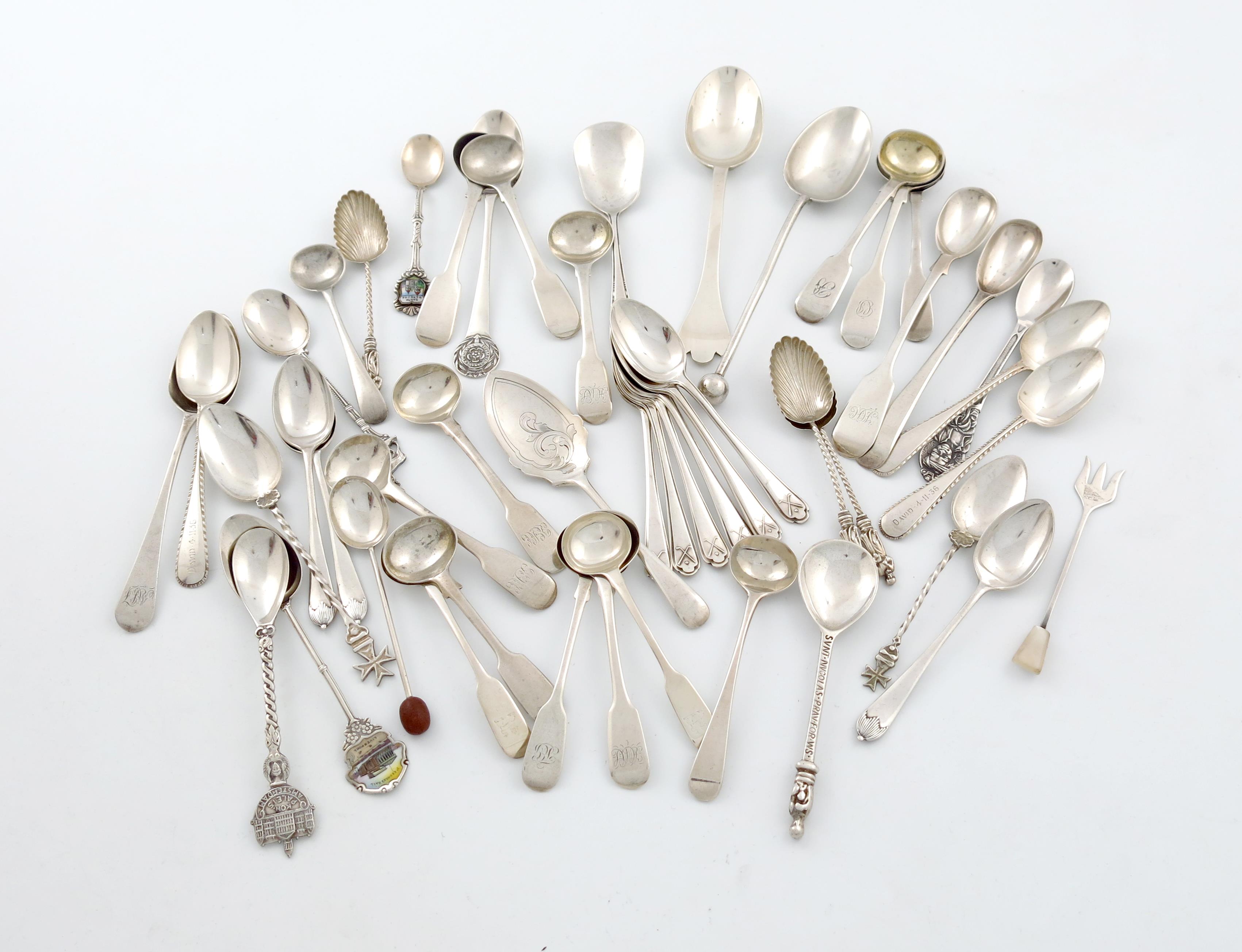 comprising: a Trefid spoon, fifteen salt spoons, two mustard spoons, a set of six golf spoons, ten teaspoons, nine souvenir spoons, three jam/sugar spoons, a pickle fork, and a coffee-bean end spoon, approx. weight 20oz. (qty)