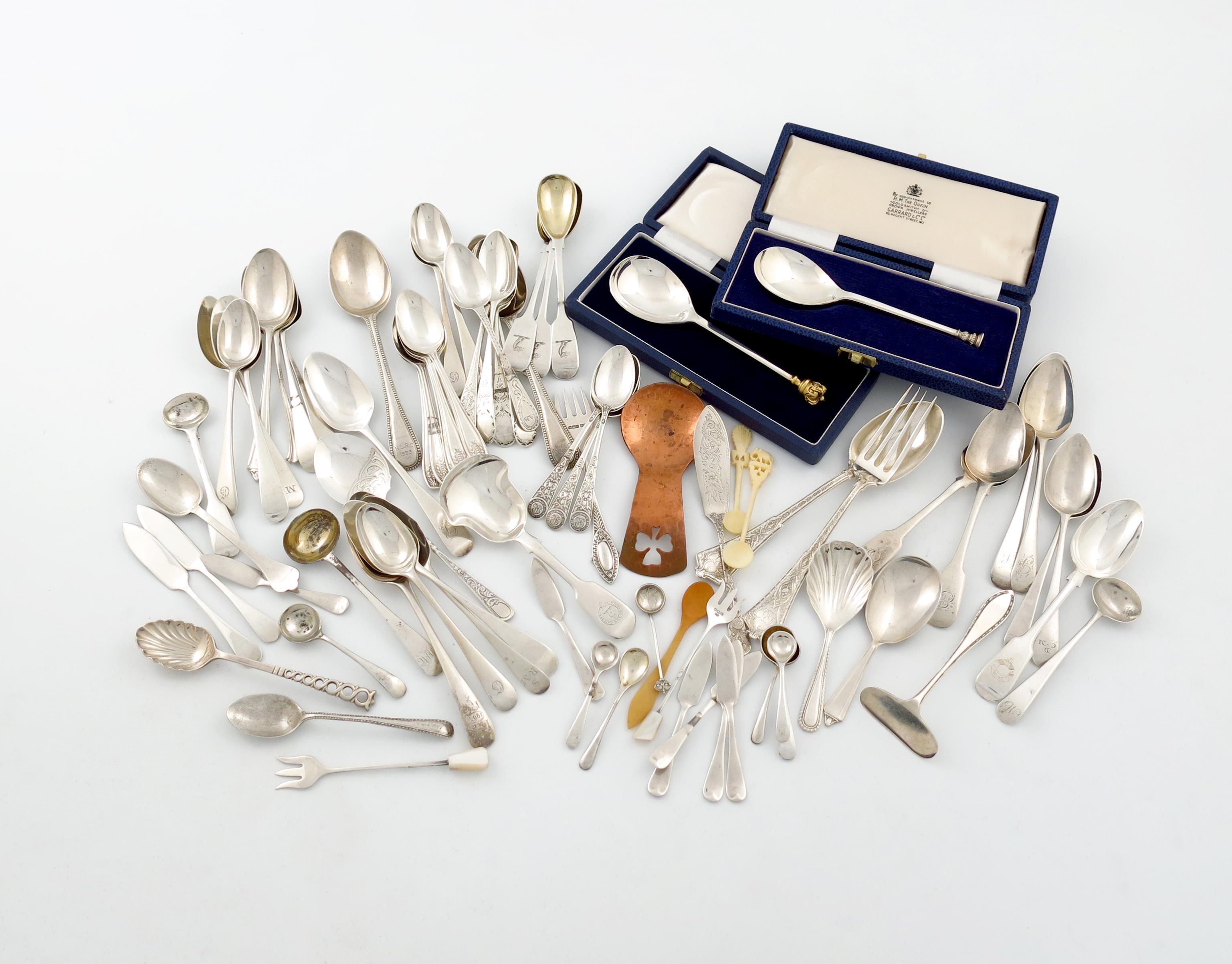 comprising: three caddy spoons, two cased spoons, a Tiffany christening fork and spoon, a set of six teaspoons, a set of six butter knives, three further butter knives, a jam spoon, a baby pusher, three Fiddle pattern egg spoons, four further egg spoons, a sugar spoon, three small forks, twenty-nine various teaspoons, plus various condiment spoons and a copper caddy spoon, marked A.J.H, Donegal, approx. weighable 31oz. (qty)
