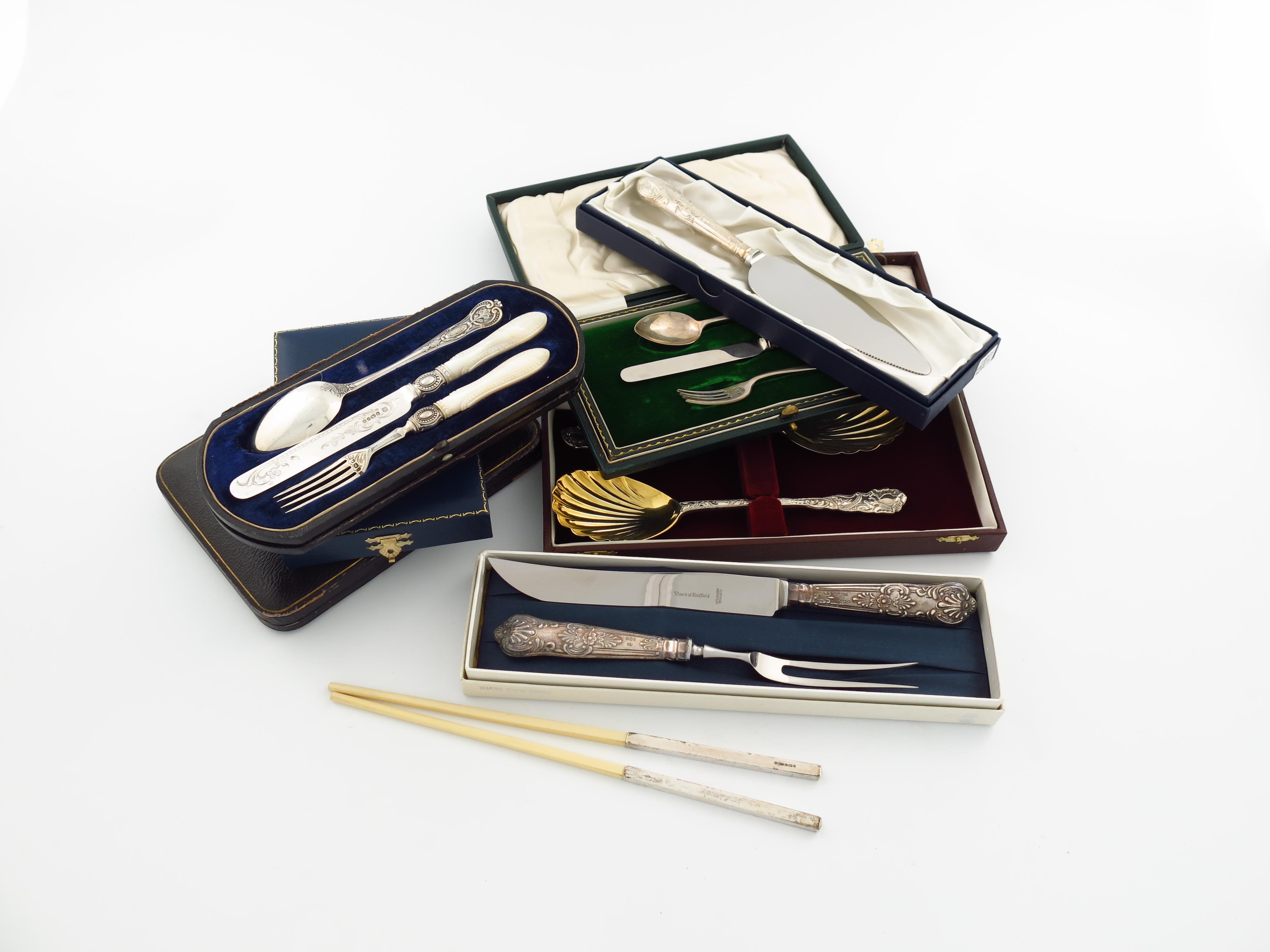comprising: a pair of fruit serving spoons, London 1901, two three-piece christening sets, a Golden Jubilee spoon, a set of six teaspoons and tongs, a pair of silver-mounted chop sticks, a King's pattern serving slice and pair of carvers, approx. weighable 10oz. (qty)