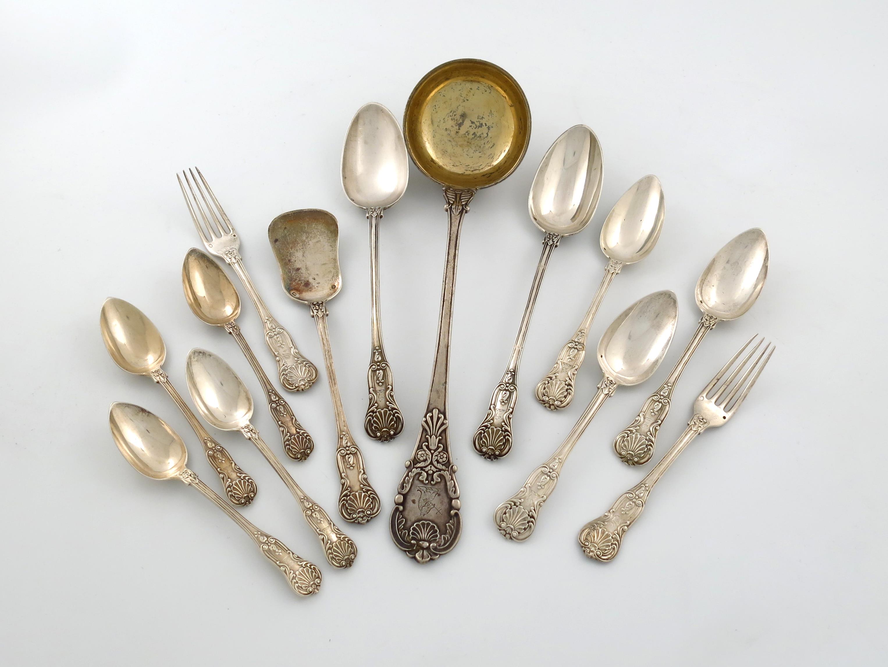 comprising: a pair of basting spoons, an ice cream spade, three tablespoons, four dessert spoons, and two table forks, plus a Continental soup ladle, marked 13, probably German, the terminal with a crest, approx. total weight 47oz. (qty)