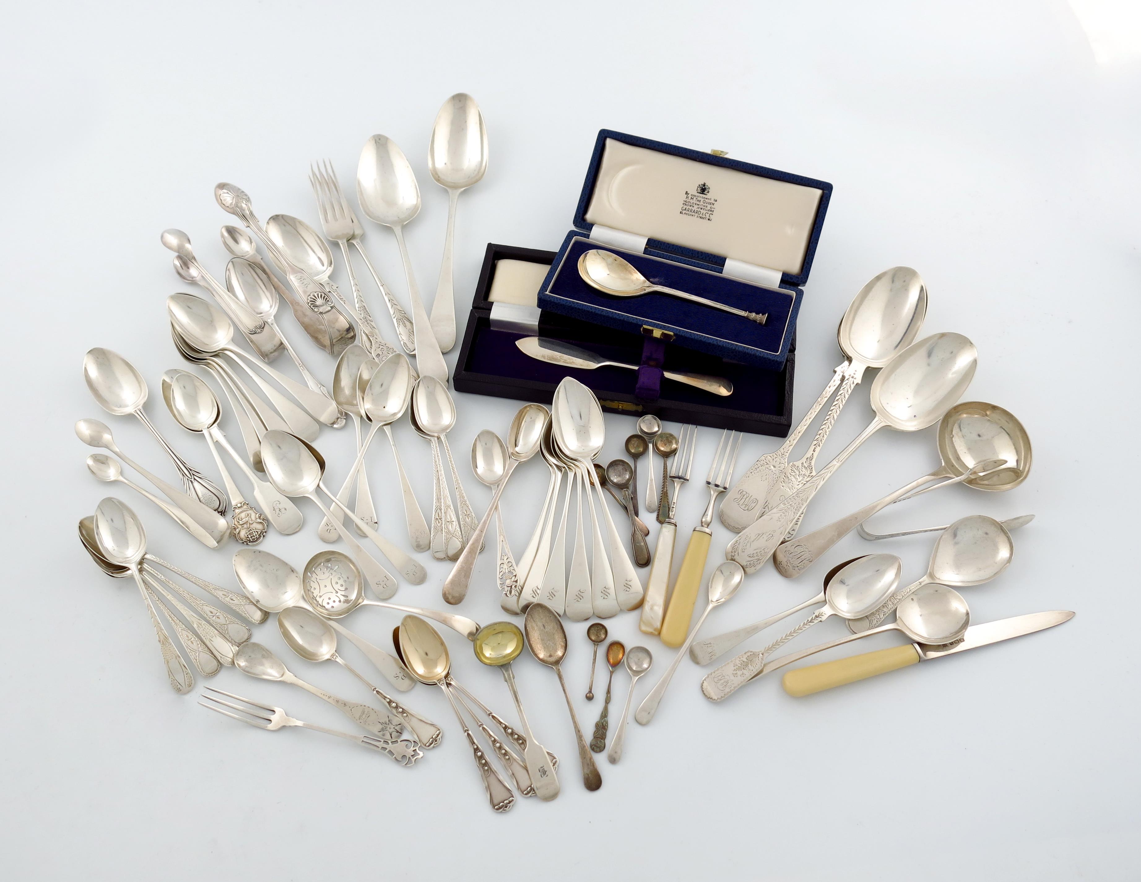 comprising: three London made, Jersey decorated tablespoons, by C.T. Maine, two dessert forks in the same manner, a cased spoon, a cased butter knife, a sauce ladle, three pairs of sugar tongs, a caddy spoon, a set of six Victorian teaspoons, by George Adams, London 1878, two tablespoons, a dessert spoon, a sifting spoon, thirteen Old English pattern teaspoons, eighteen other teaspoons, eleven condiment spoons, a jam spoon, three forks, a knife and two electroplated items, approx. weight 50oz. (qty)