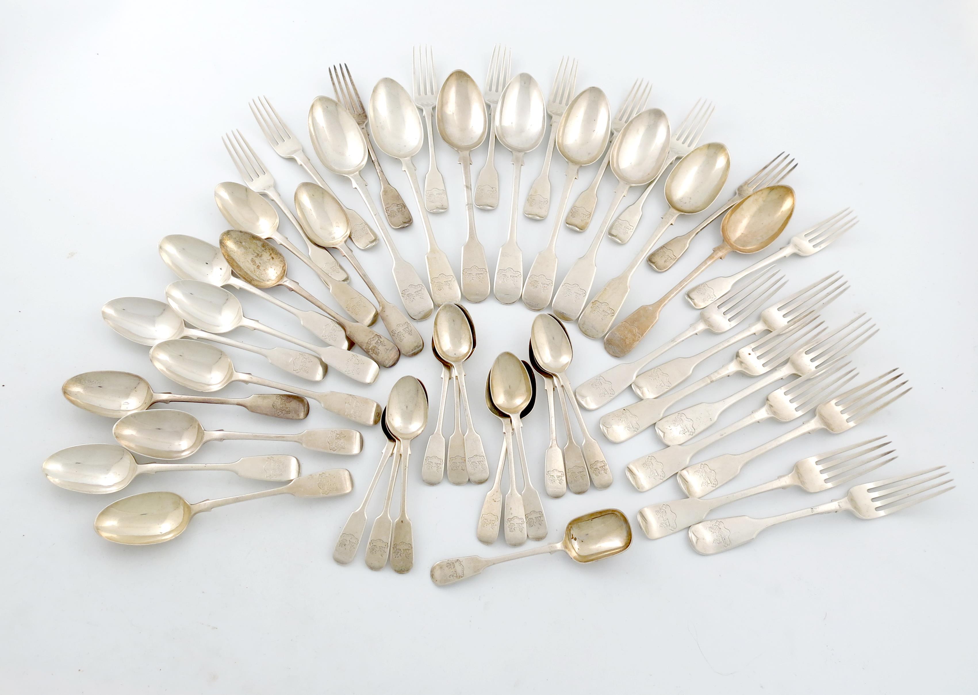 the terminals with the Kemey-Tynte crests, comprising: eight tablespoons, eight table forks, ten dessert forks, eleven dessert spoons, twelve teaspoons and a sugar spoon, approx. weight 80oz. (50)
