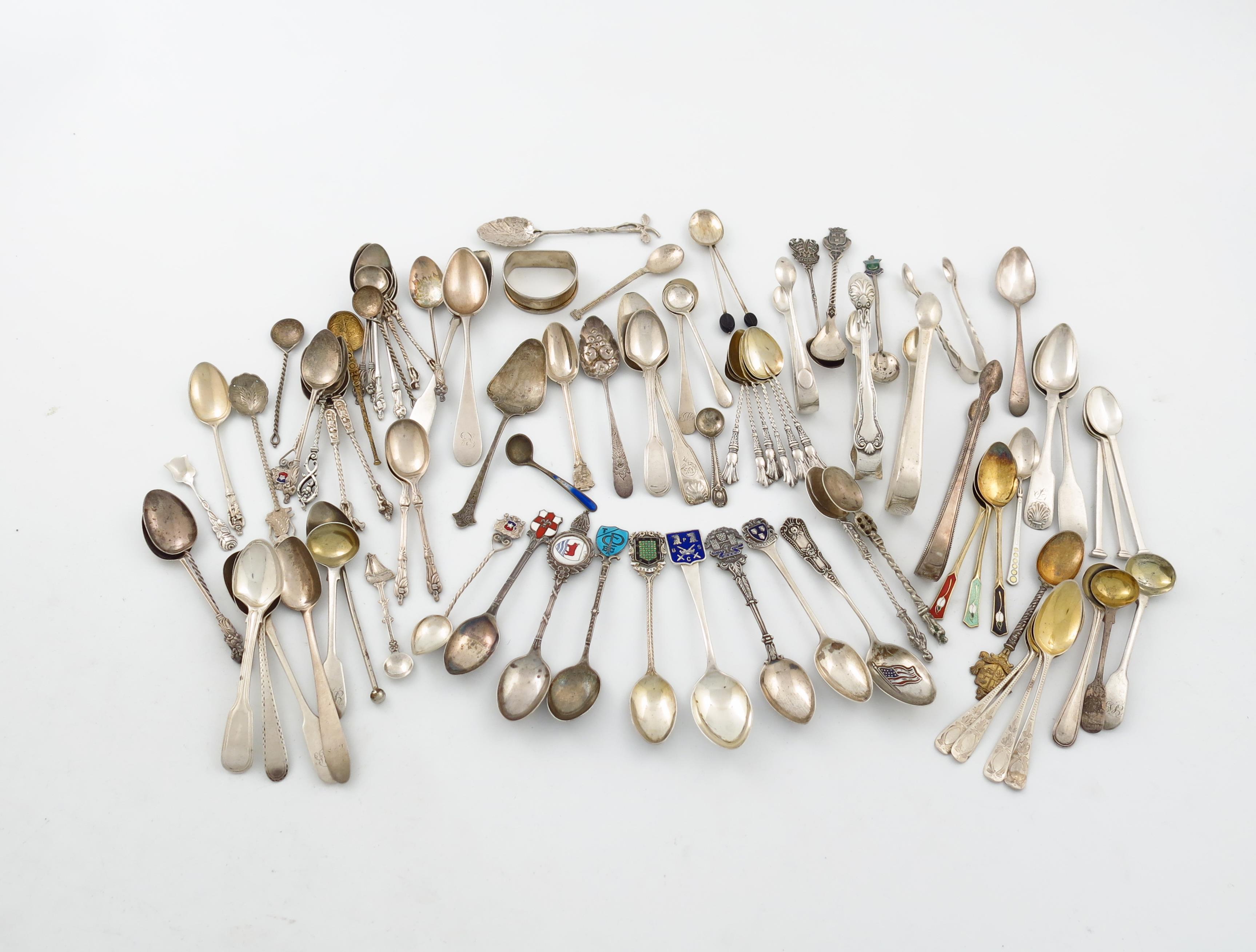 comprising: a pair of Fiddle and Thread pattern egg spoons, eight silver and enamel souvenir spoons, and various teaspoons, and condiment spoons, six teaspoons, plus various teaspoons and other items including a napkin ring, approx. weight 30oz. (qty)