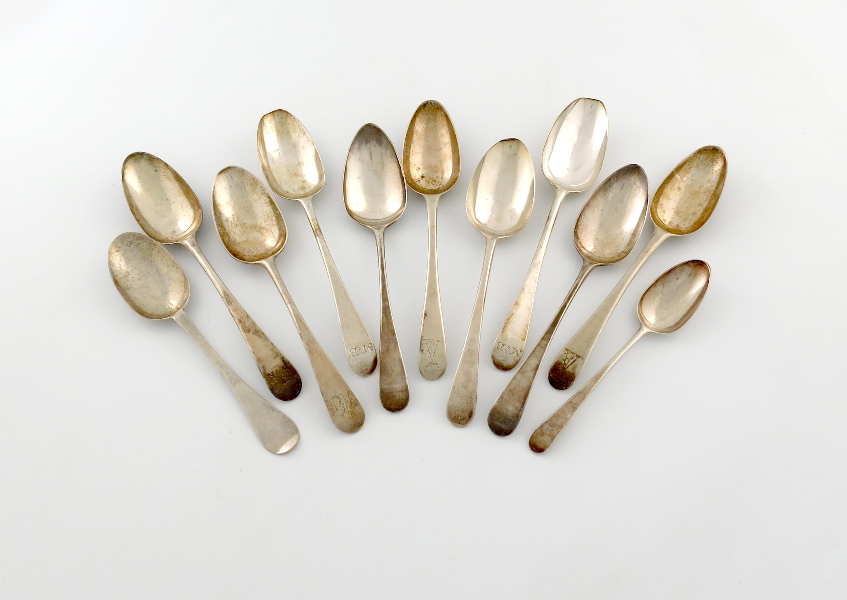 comprising: two pairs of tablespoons, five single tablespoons, and a dessert spoon, plus a spoon with maker's mark PS, the terminal of re-shaped and rounded form, probably from a trefid, approx. weight 19oz. (11)