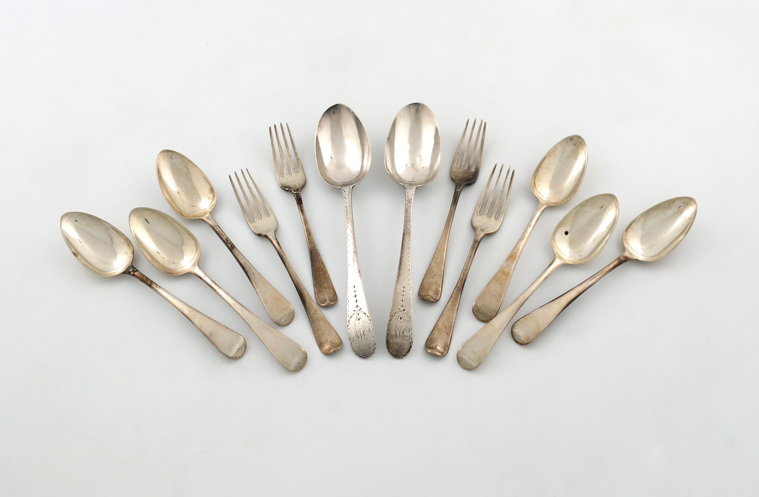comprising: a set of six Old English pattern dessert spoons, London 1807, by Crossley and Smith, London 1807, plus a pair of Bright-cut tablespoons, by Hester Bateman, London 1782, and four Old English pattern dessert forks, approx. weight 15oz. (12)