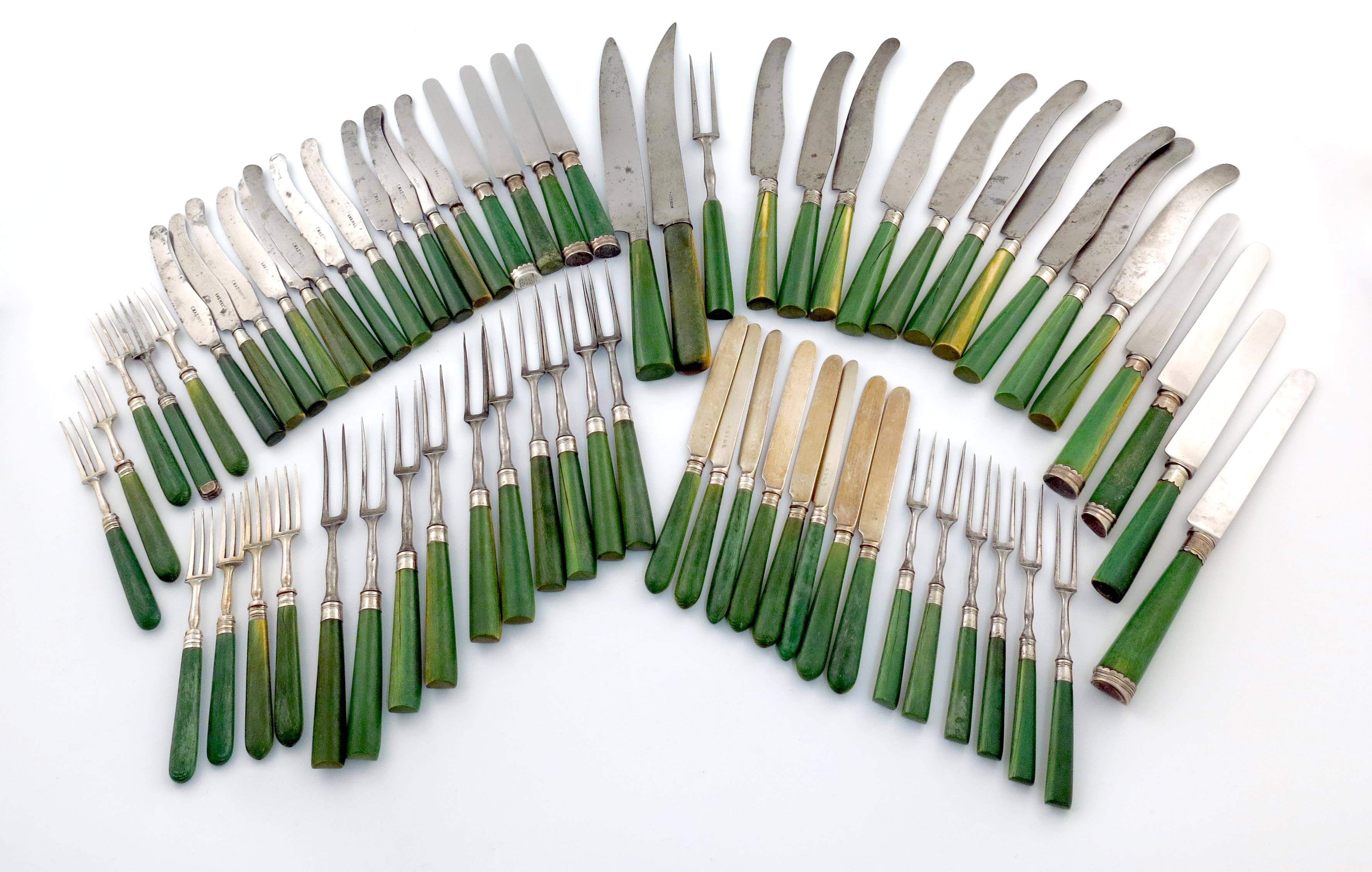 comprising: ten two pronged steel table forks, six two-pronged dessert forks, a set of ten table knives, a set of eleven dessert knives, plus four other table knives and four dessert knives, a carving fork, two carving knives and nine various fruit forks and eight fruit knives. (qty)