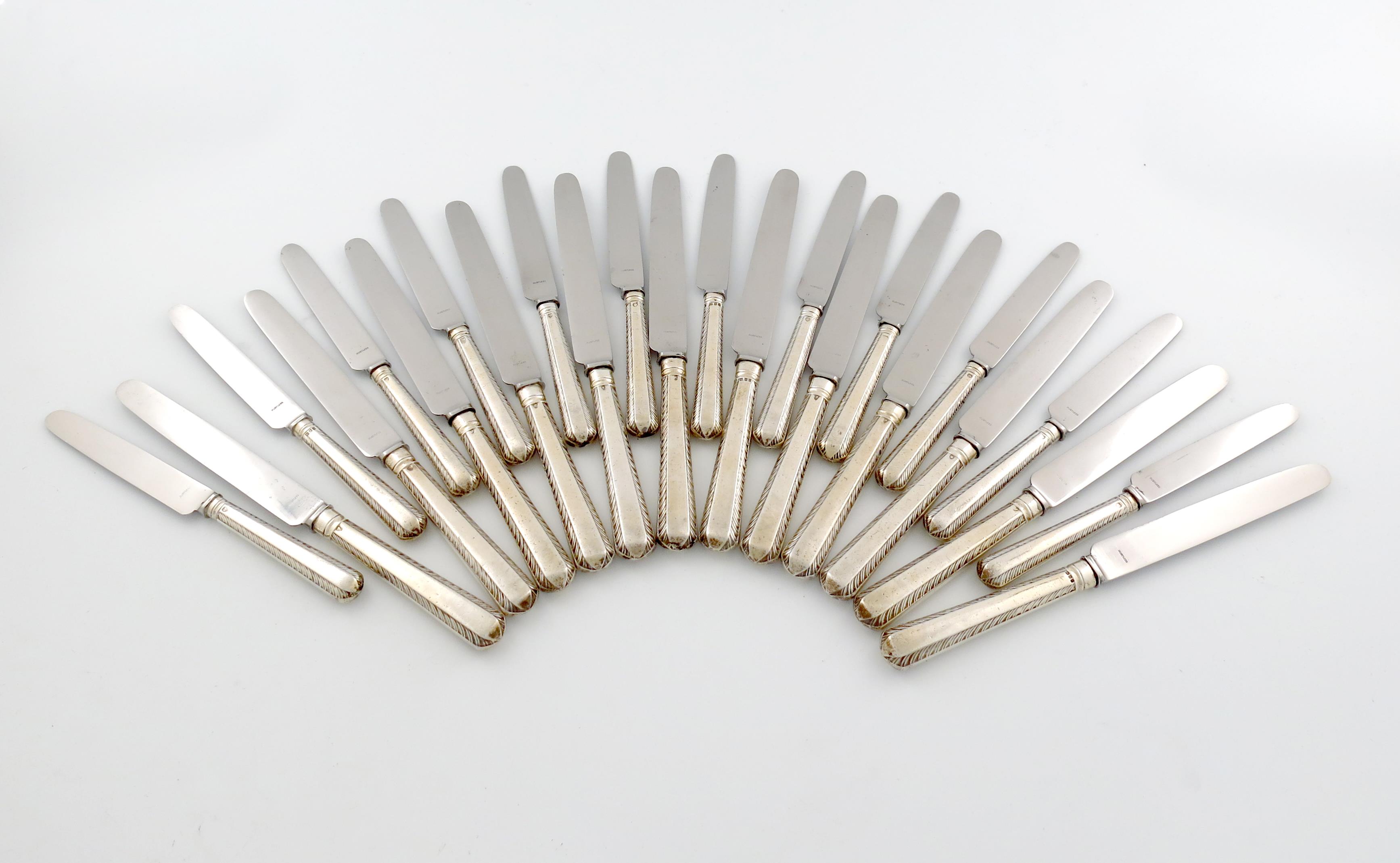 A set of twelve silver Feather-edge pattern table knives and twelve dessert knives