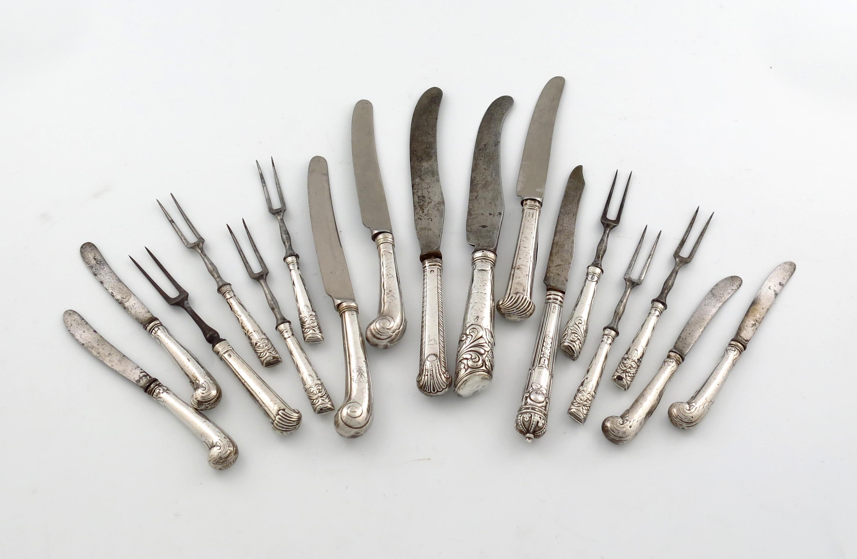 comprising: a George III knife, by Eley and Fearn, London 1818, the tapering handle with a crown finial, and initialled 'N', plus five various silver-handled table knives and seven two-pronged steel dessert forks, and four dessert knives. (17)