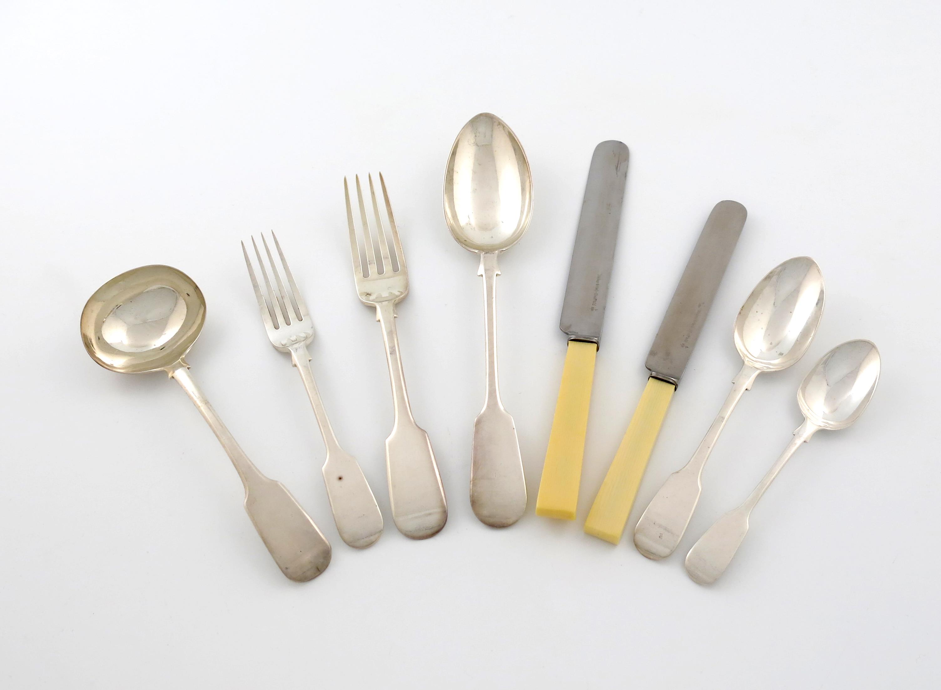 comprising: twelve table forks, by Hayne and Cater, London 1851, twelve dessert forks, by Elizabeth Eaton, London 1850, twelve dessert spoons, by Henry Holland, London 1864, twelve various tablespoons, twelve various teaspoons, and a pair of sauce ladles, plus twelve table knives, twelve dessert knives and twelve cheese knives, approx. weight 105oz. (qty)