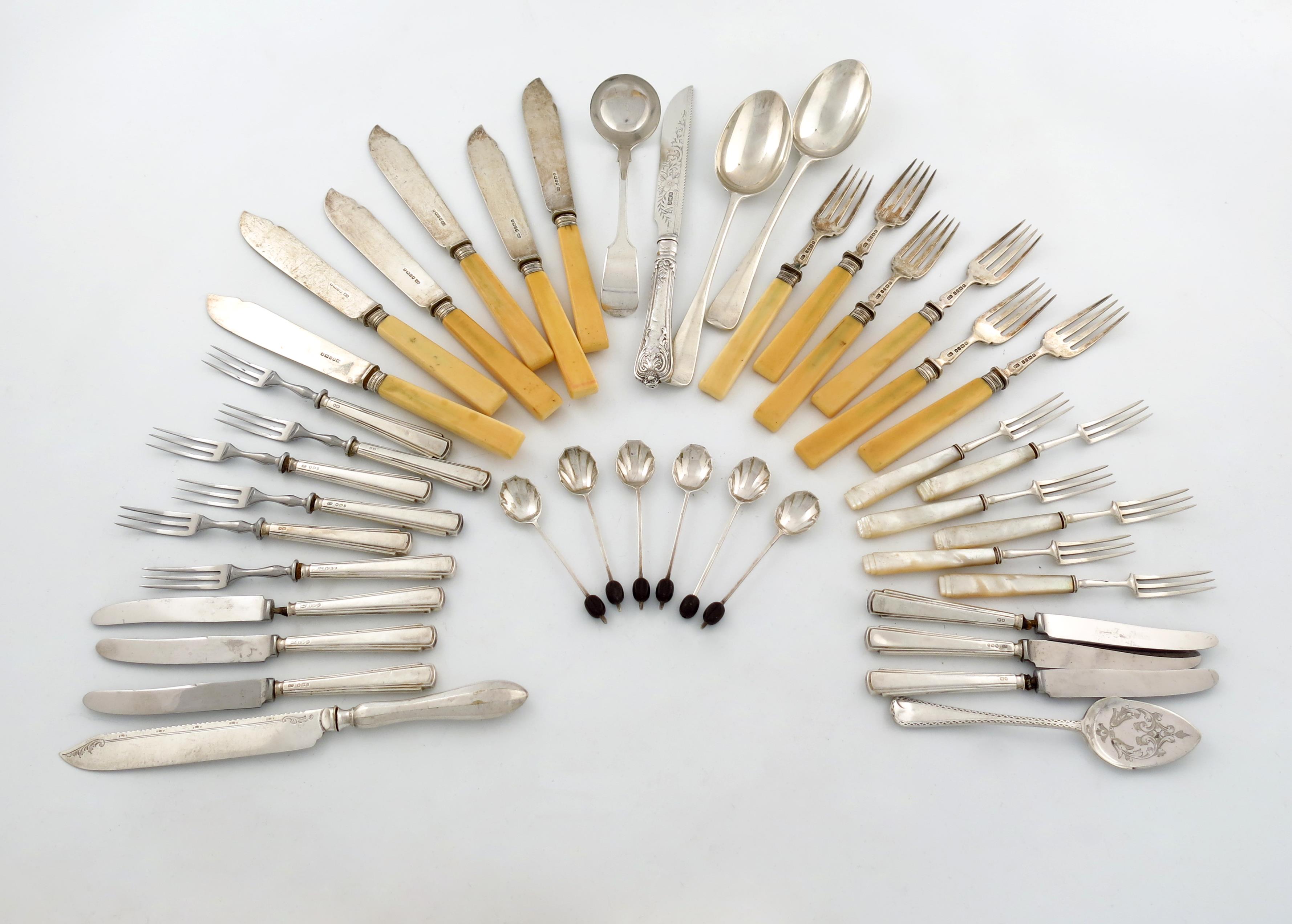 comprising: a set of six Victorian fish knives and forks, Sheffield 1881, plain blades, and ivory handles, two Hanoverian tablespoons, London 1900, six fruit forks, with mother-of-pearl handles, six silver-handled fruit forks and knives, a silver bread knife, plus electroplated items: a ladle, a jam spoon, a bread knife and six coffee spoons, approx. weighable 4.6oz. (qty)