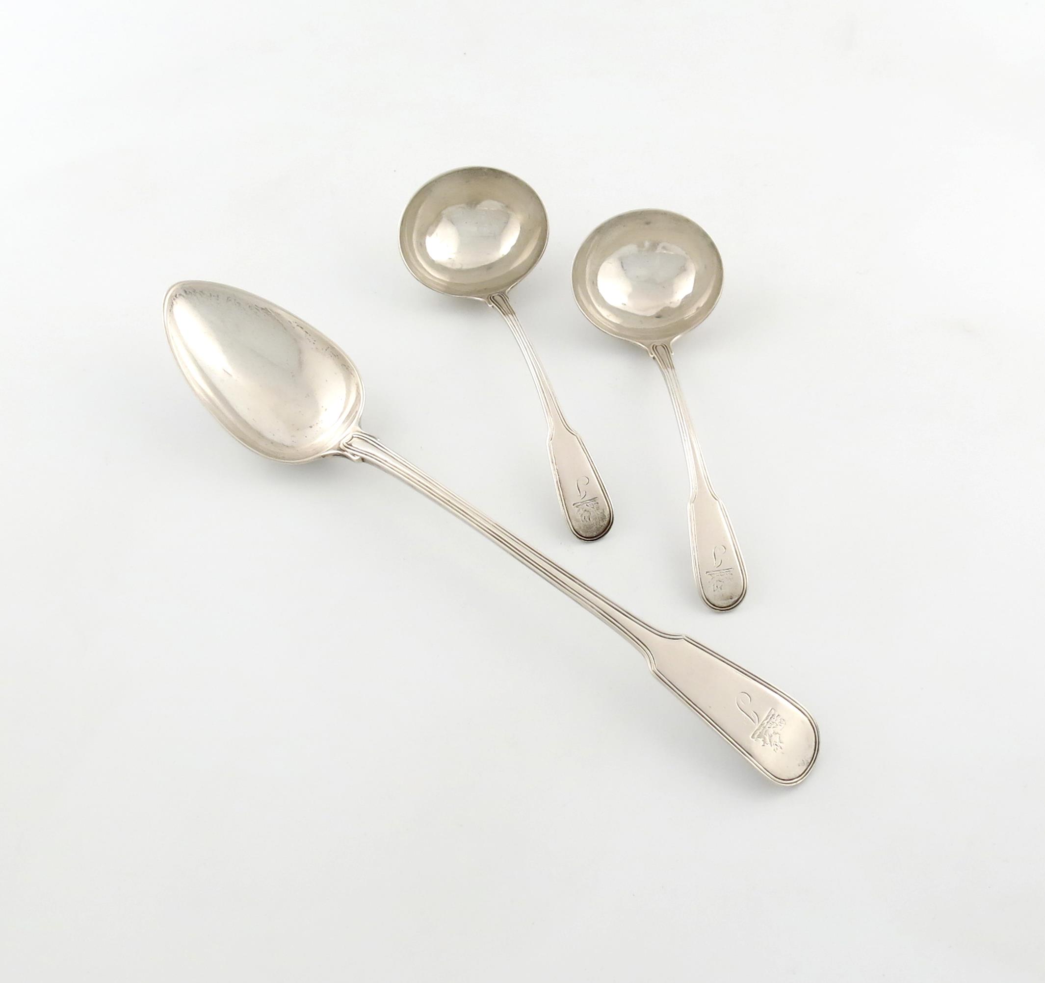 A George III silver Fiddle and Thread pattern basting spoon and pair of sauce ladles