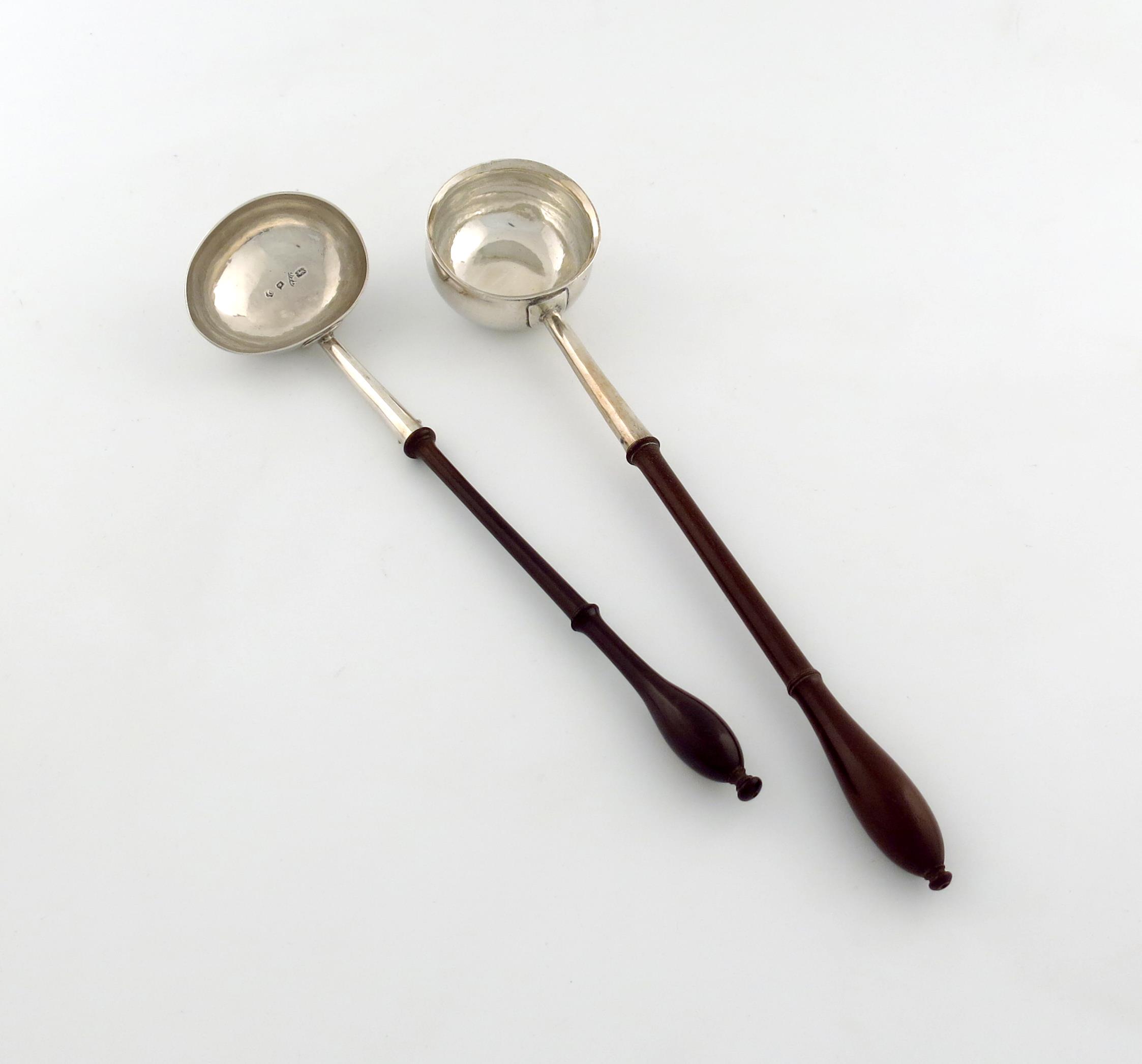 maker's mark worn, London 1722, circular bowl, turned wooden baluster handle, scratch initialled 'W' over 'TM', plus a George II silver toddy ladle, maker's mark possibly IP script, 1740, oval 'goose-egg' bowl, turned wooden baluster handle, scratch initialled 'C' over 'WS', , length 31cm, (2)