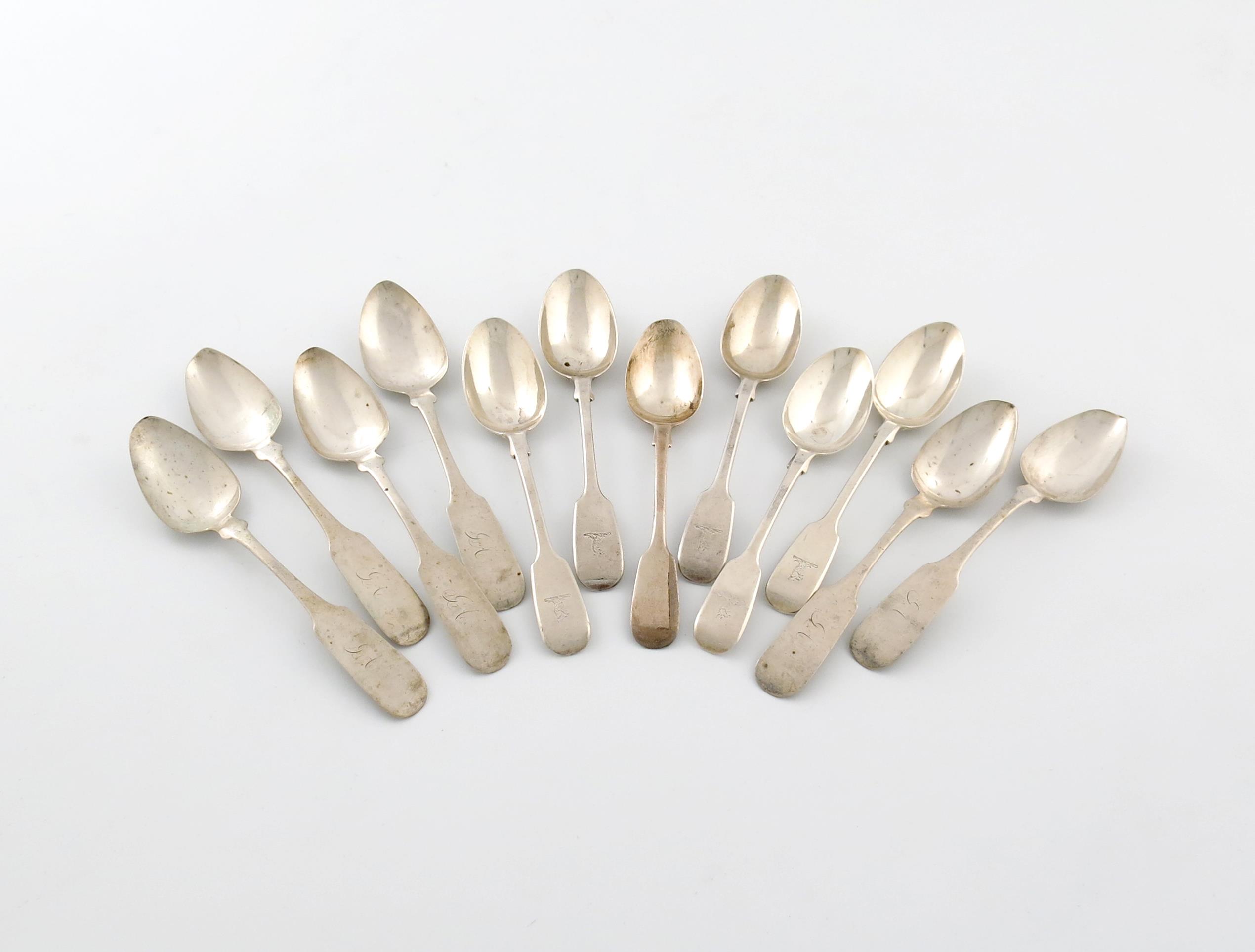 the terminal with a crest, plus another Fiddle pattern teaspoon, and a set of six 19th century North American silver teaspoons, by P. Mason, approx. total weight 7oz. (12)