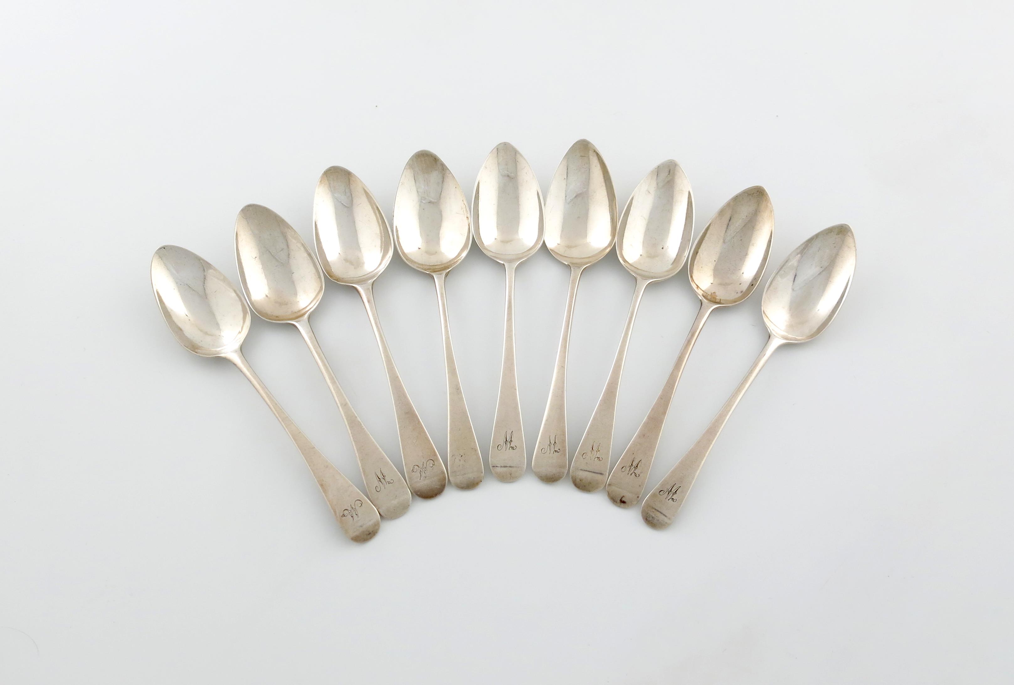 A matched set of nine George III silver Old English pattern dessert spoons