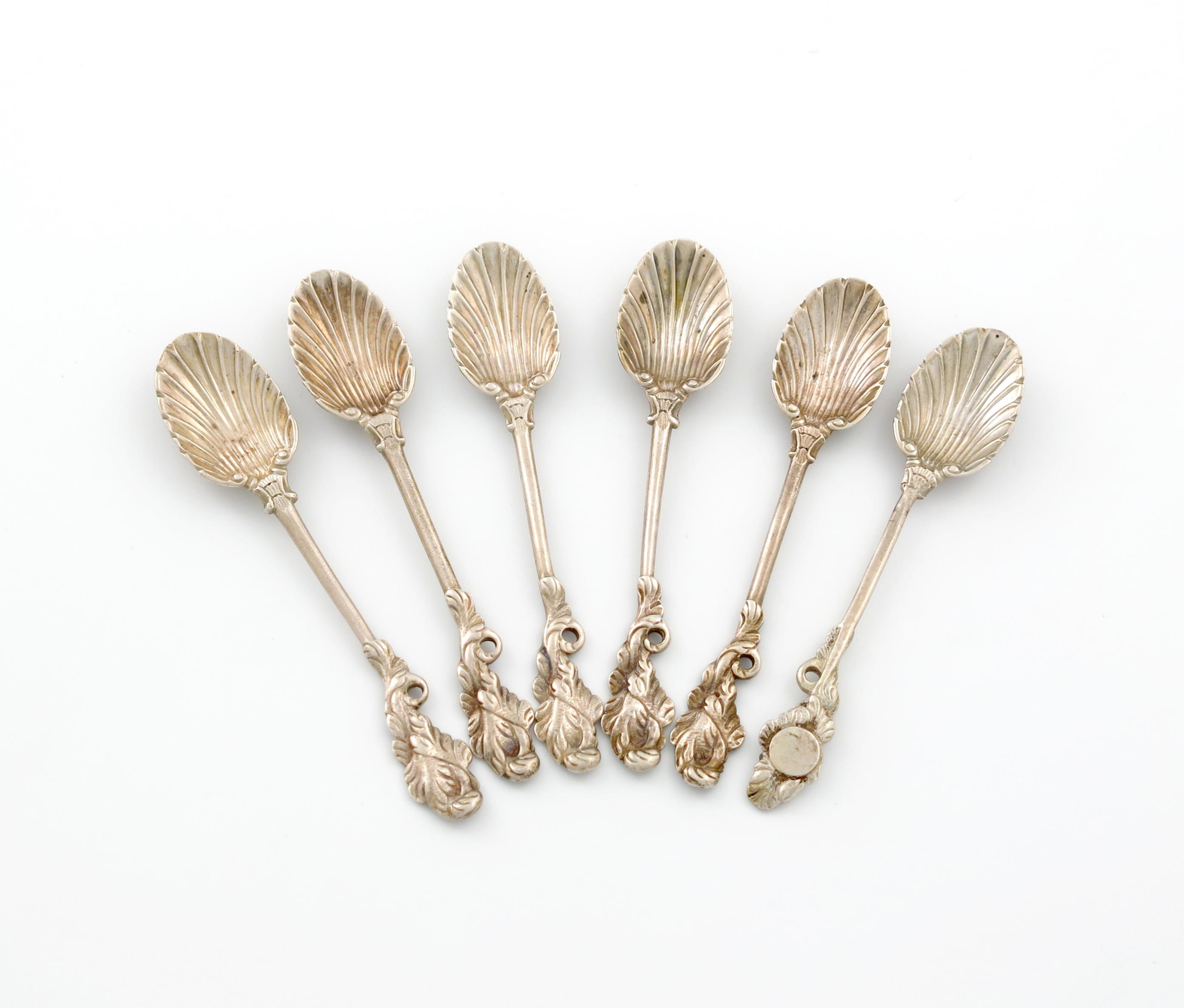 shell shaped bowls, pierced foliate terminals with a vacant cartouche, length 10.6cm, approx. weight 2.7oz. (6)