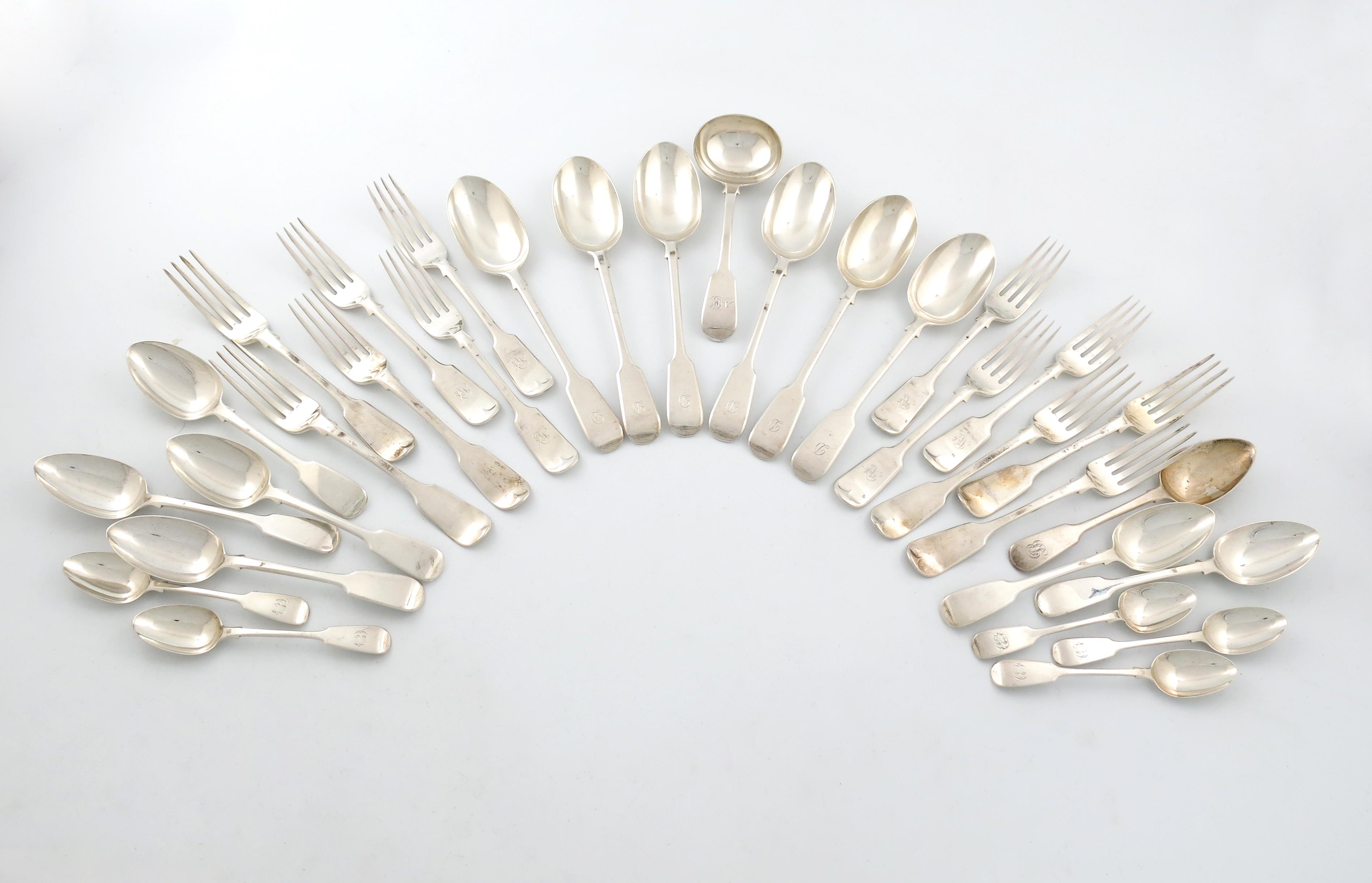 some with monograms, comprising: six tablespoons, London 1919, six table forks, London 1827, six further table forks, Birmingham 1925, six dessert spoons, London 1831, plus five teaspoons, a sauce ladle and a dessert spoon, approx. weight 58oz. (qty)