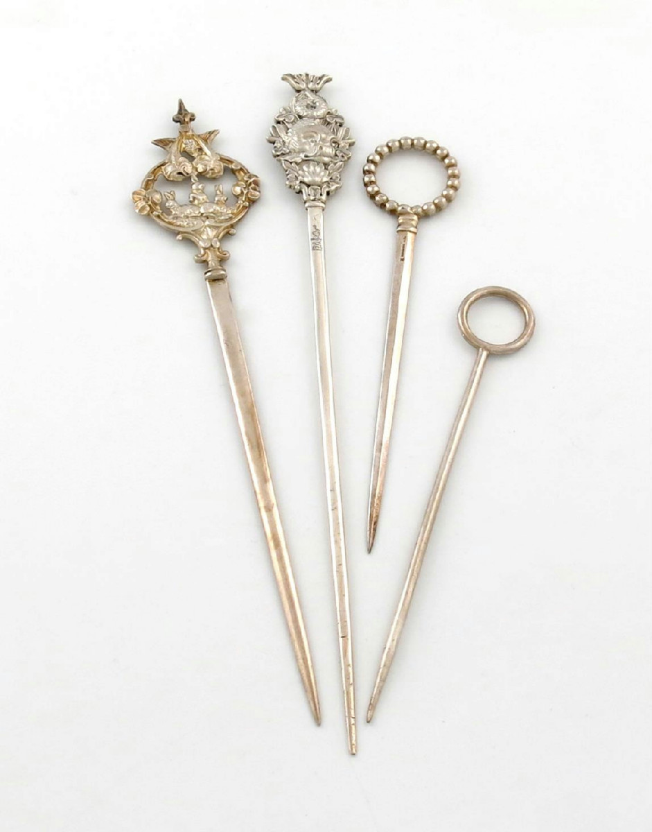 the terminal with a mythical dolphin within foliate and shell decoration, engraved with two crests, length 24.3cm, plus three electroplated meat skewers, approx. weighable 1.1oz. (4)