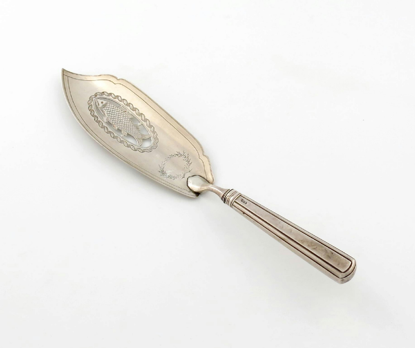 the blade pierced and engraved with a fish, tapering thread handle, length 31.4cm.