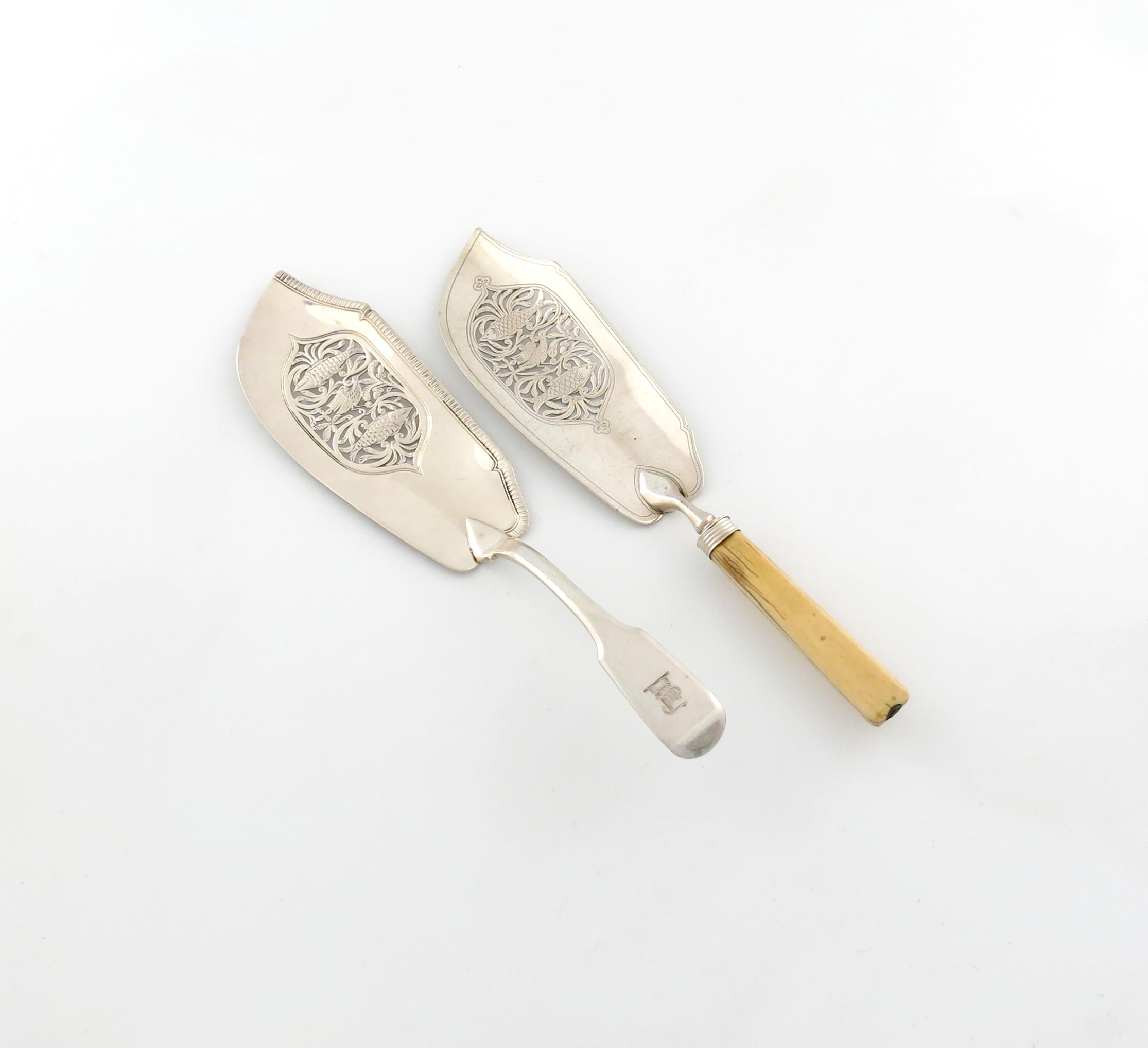 gadroon border, the blade pierced and embossed with two fish and a bird, gadroon border, the terminal with a crest, plus a George III silver fish slice, probably by the same maker, London 1819, the blade with similar decoration, tapering ivory handle, approx. weighable 4.4oz. (2)