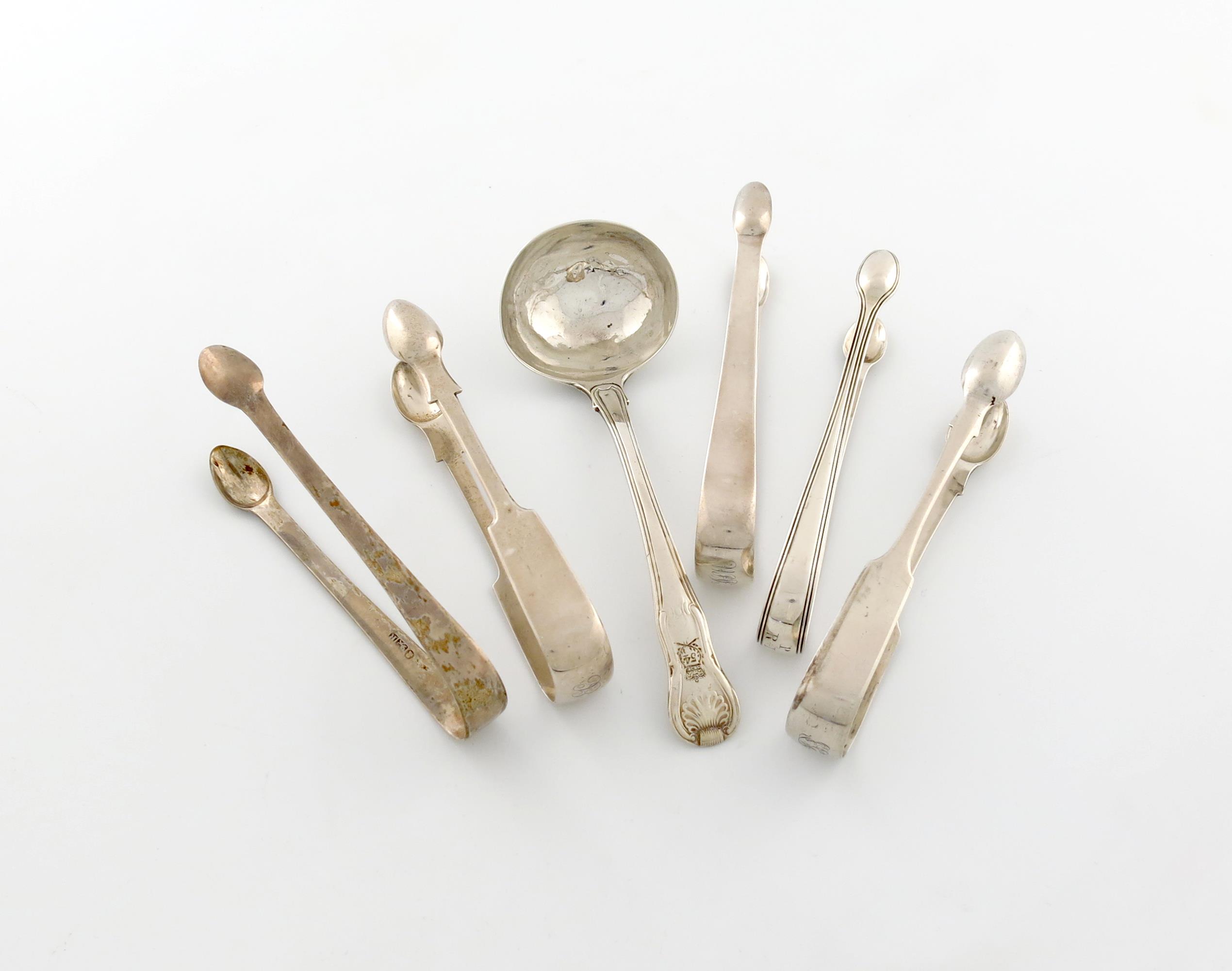comprising: two pairs of Newcastle sugar tongs, three further pairs, and a George II regimental King's Hourglass pattern sauce ladle, engraved '54' below a crown, approx. weight 8.5oz. (6)